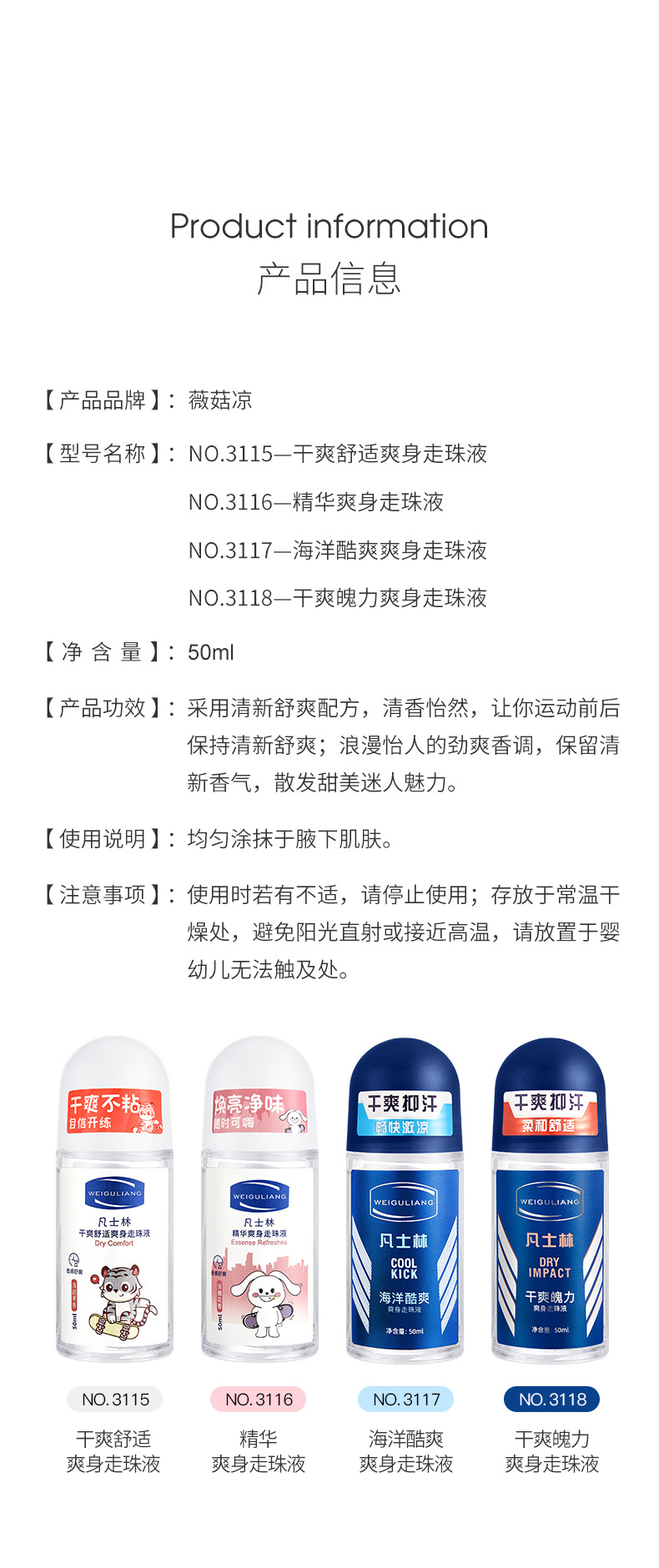 薇莲涼ワセリン香体露爽やかで快適な走珠液男女腋の下止汗長持ち香学生止汗露