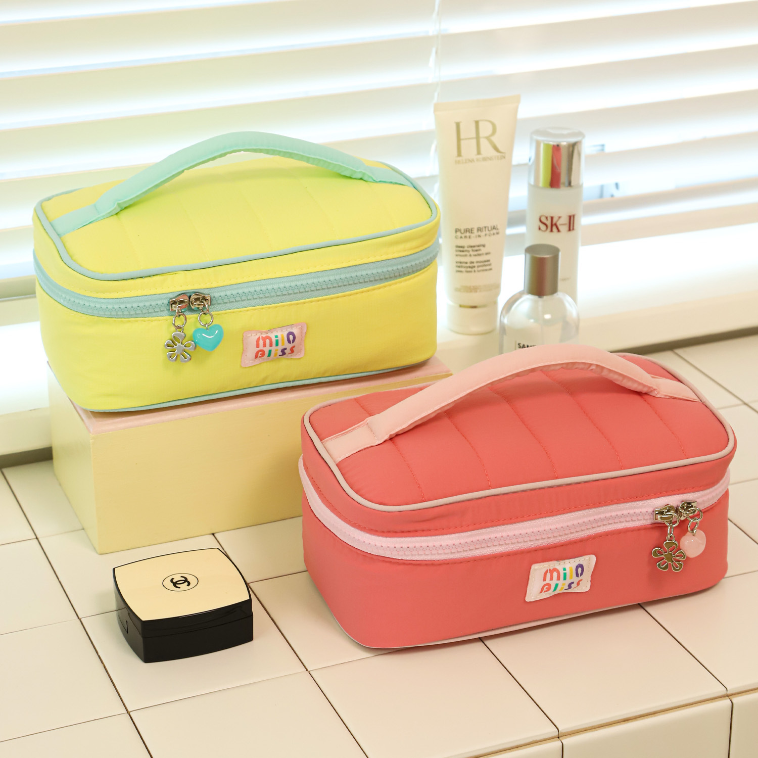 かわいいコントラストカラーのポータブル化粧品バッグ、大容量のハイエンドトイレタリーバッグ、高価値の化粧品収納バッグ