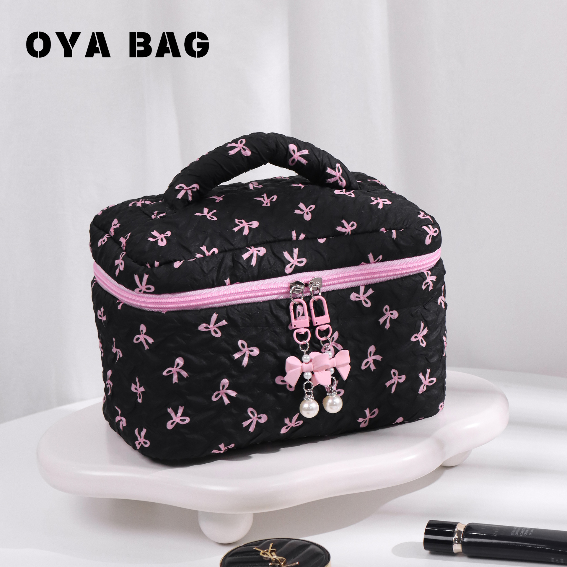 エンボス加工のプリーツリボン化粧ポーチ、大容量、高級感、高外観性、多機能収納バッグ、最低注文数1個から