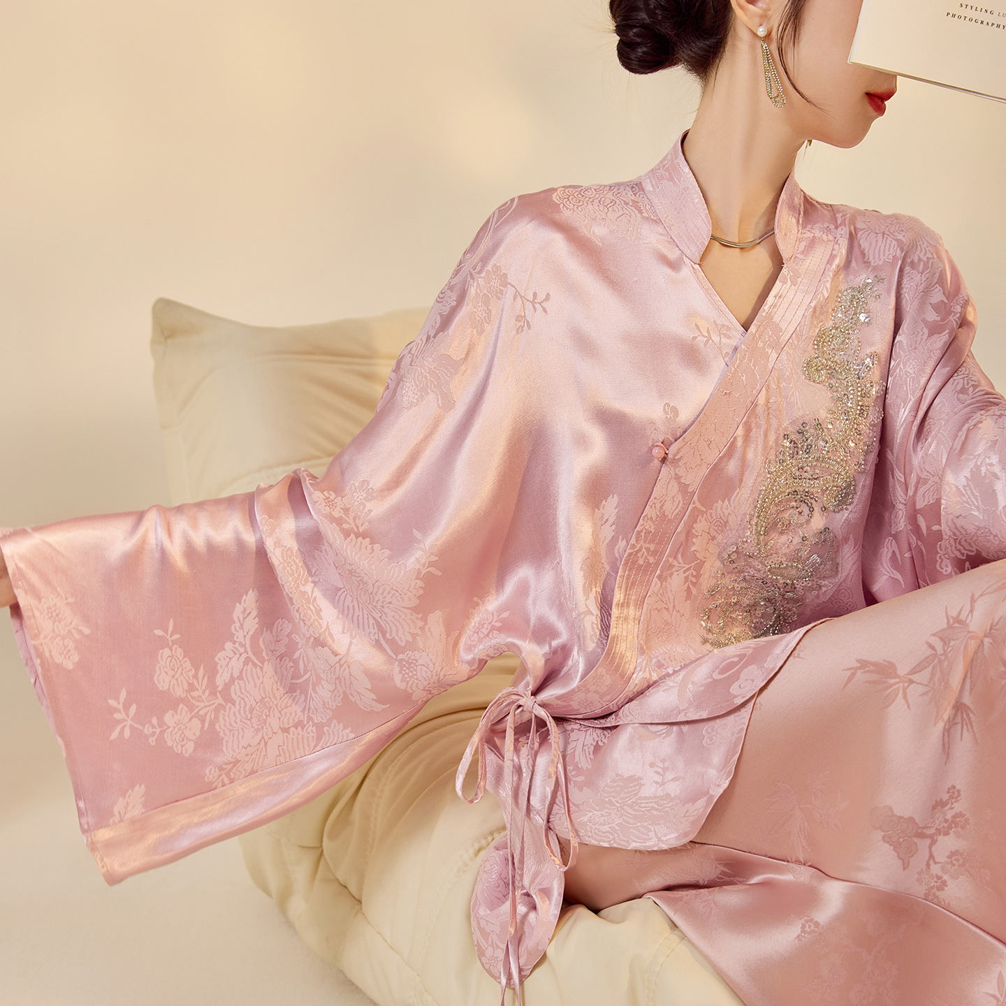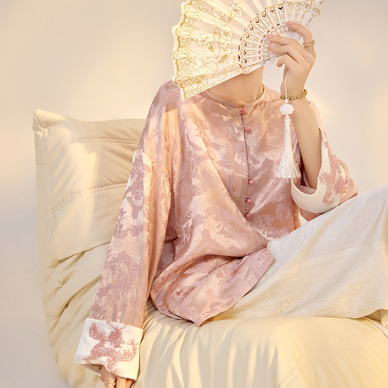 新中式風ジャカード刺繍龍刺繍アセテートシャツ ピンクの上品な長袖トップス M3075 アセテート生地