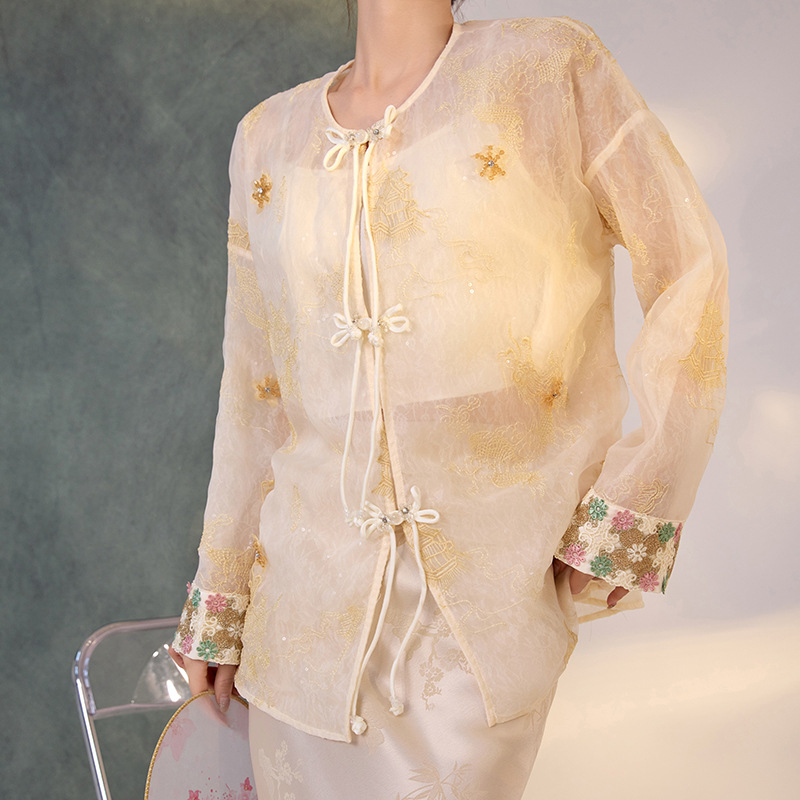 100% 绢糸春シーズンモデル新中国式国風網糸盤ボタン刺繍シャツ気質小衆上着m3107