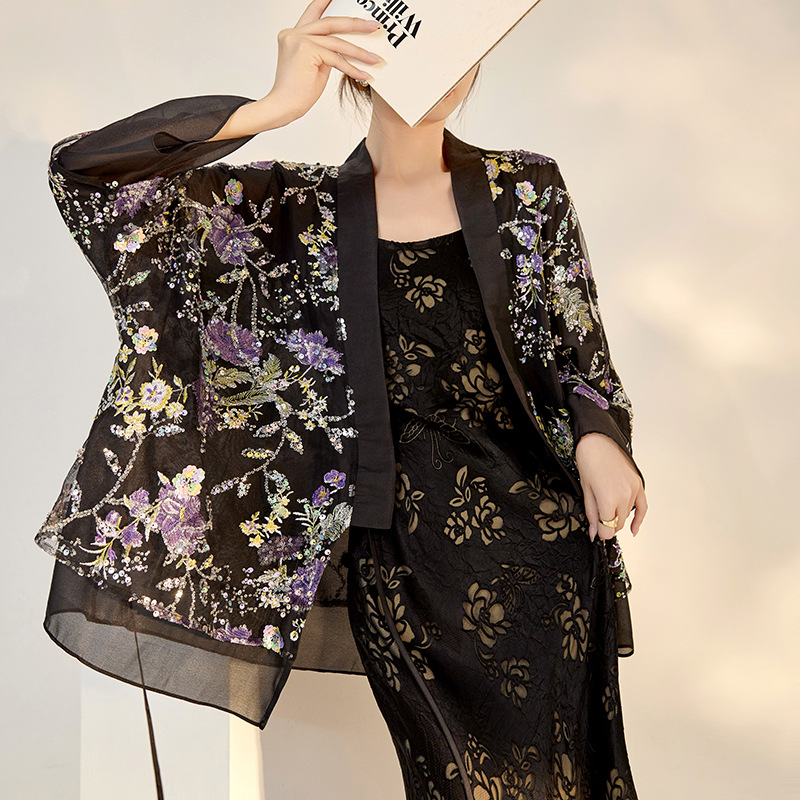 2025 新中国風重工業花スパンコール刺繍ライト高級立体花レースアップカーディガンジャケット M6108