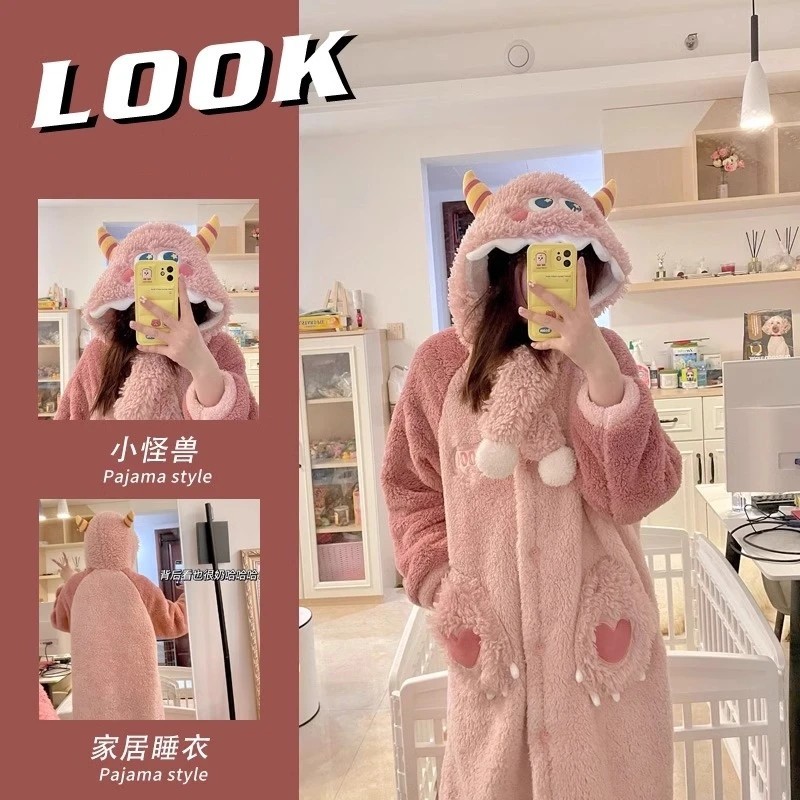 かわいいモンスターのサンゴのベルベットの寝衣の女性秋冬の新型の厚い保温パジャマの家の服のスーツは外で着ることができます。