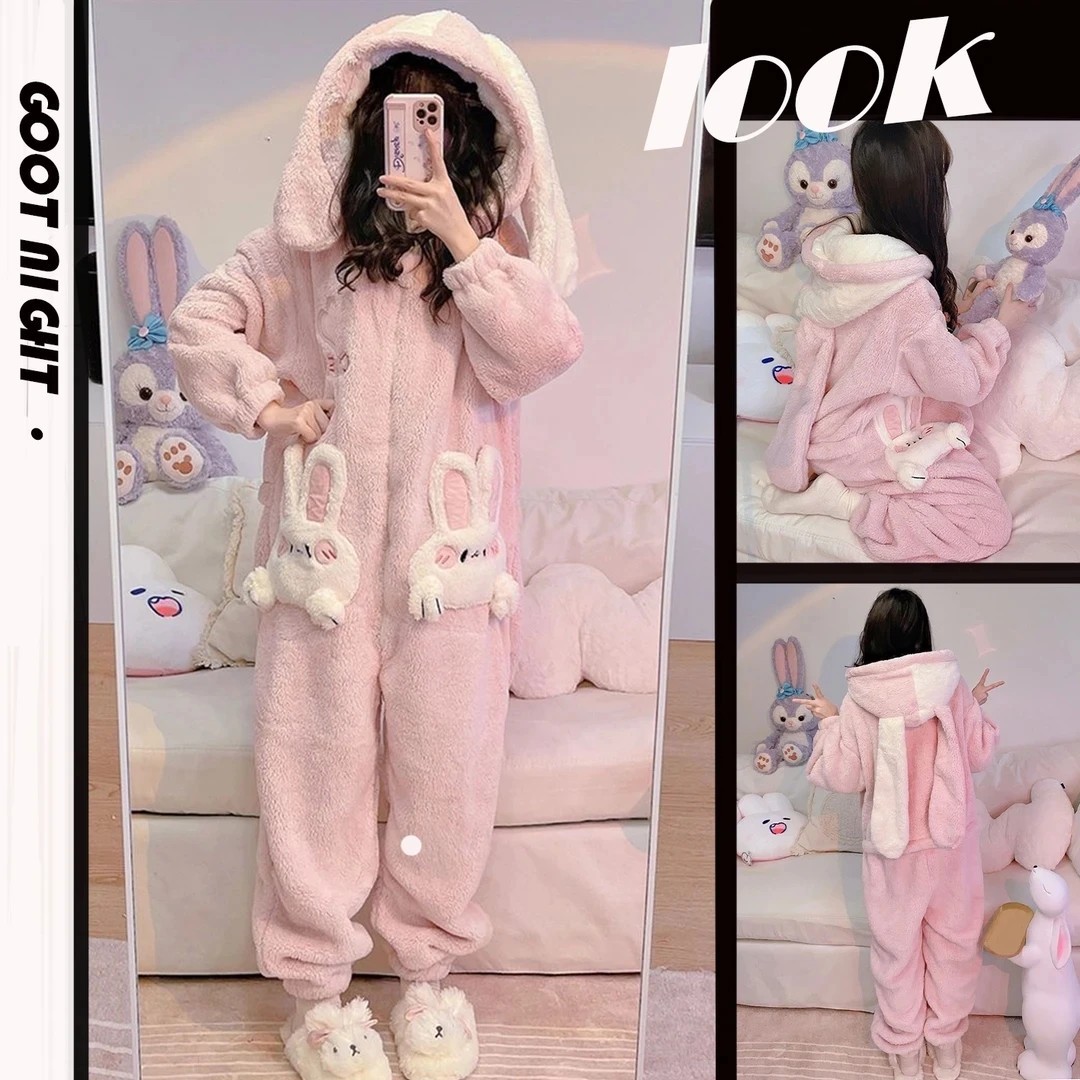 冬のワンピースパジャマ女性かわいい漫画ウサギの帽子サンゴのベルベットとベルベットの厚い保温フランネルの家庭服