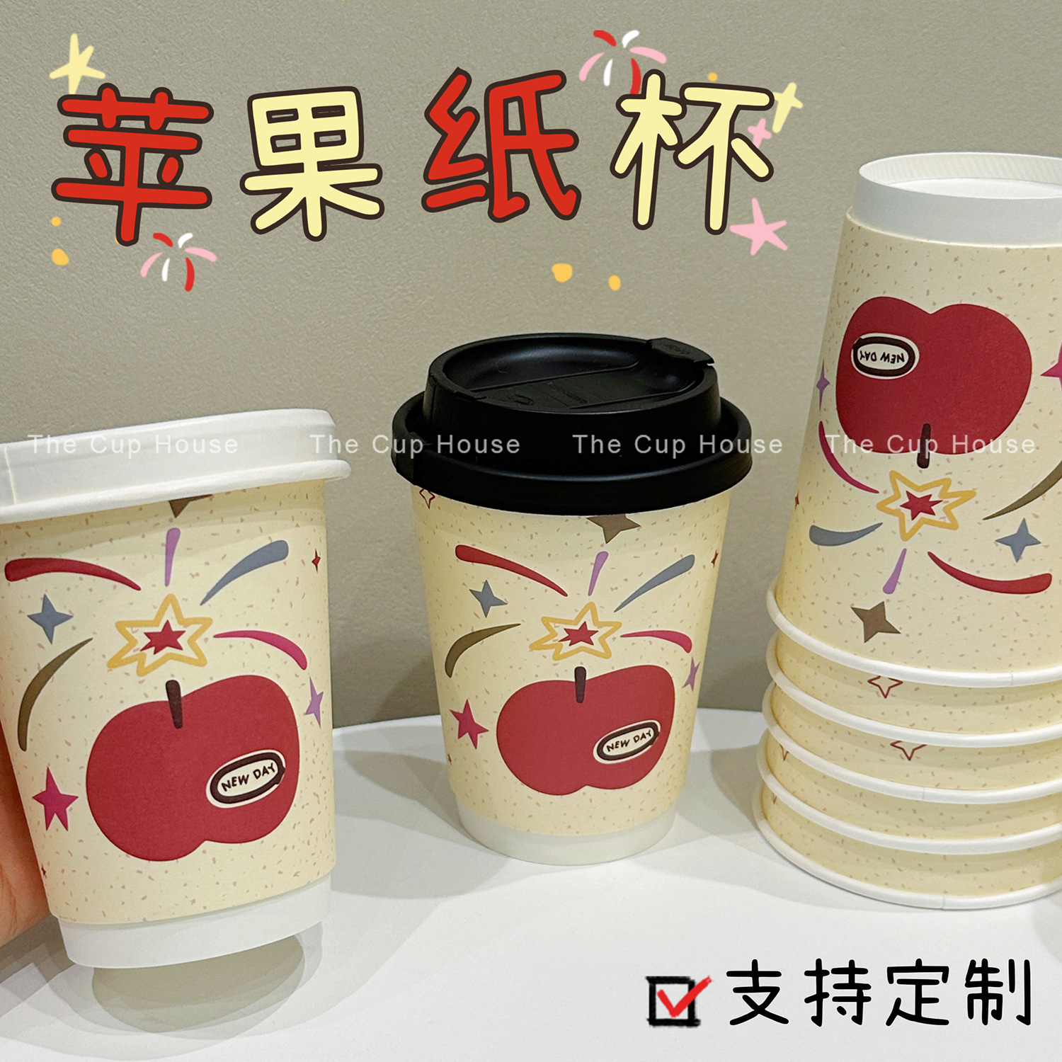 圣诞苹果纸杯一次性咖啡纸杯新年纸杯烟花纸杯热饮加厚纸杯400ml