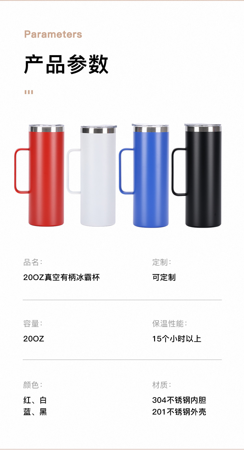 20オンスの取っ手付き車用カップ、二重真空構造、304ステンレス製ストレートウォーターカップ、ロゴの3D/5D印刷可能、二重断熱