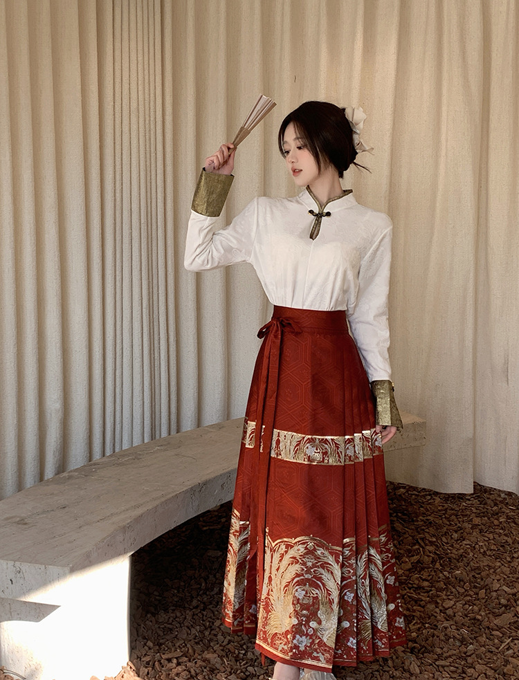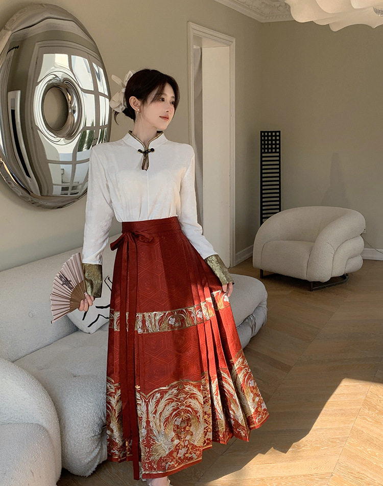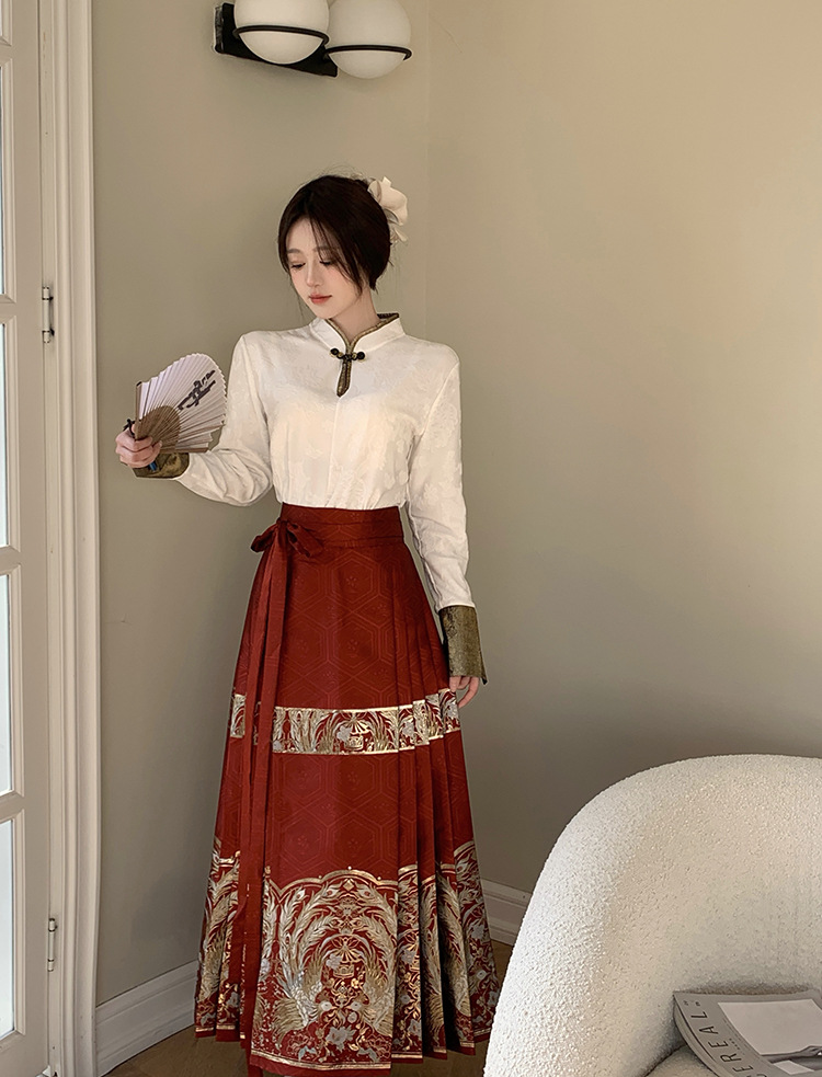 新中国式のレトロなチャイナドレスの上着の女性の金のシルクの熱いジャカードの気質の百合のシャツは馬のスカートの2つのセットを改良します。