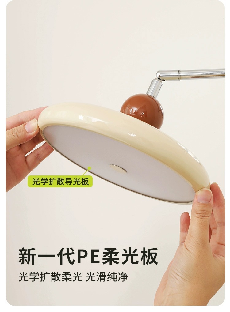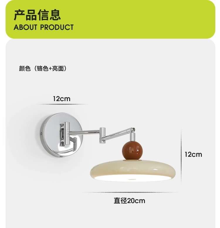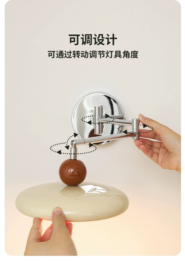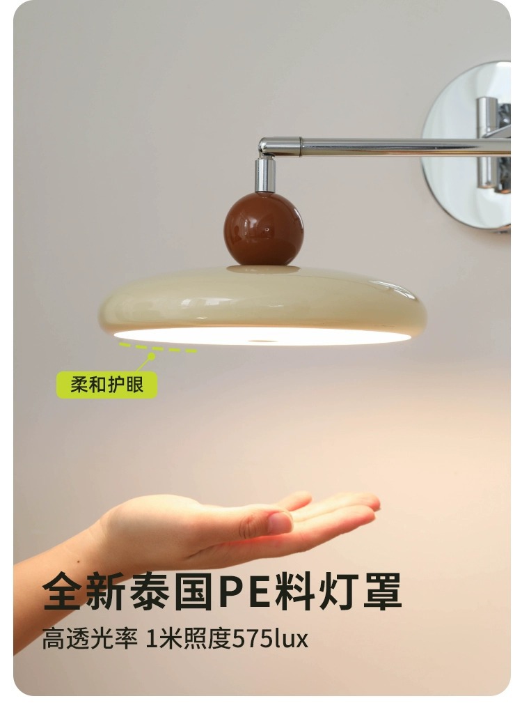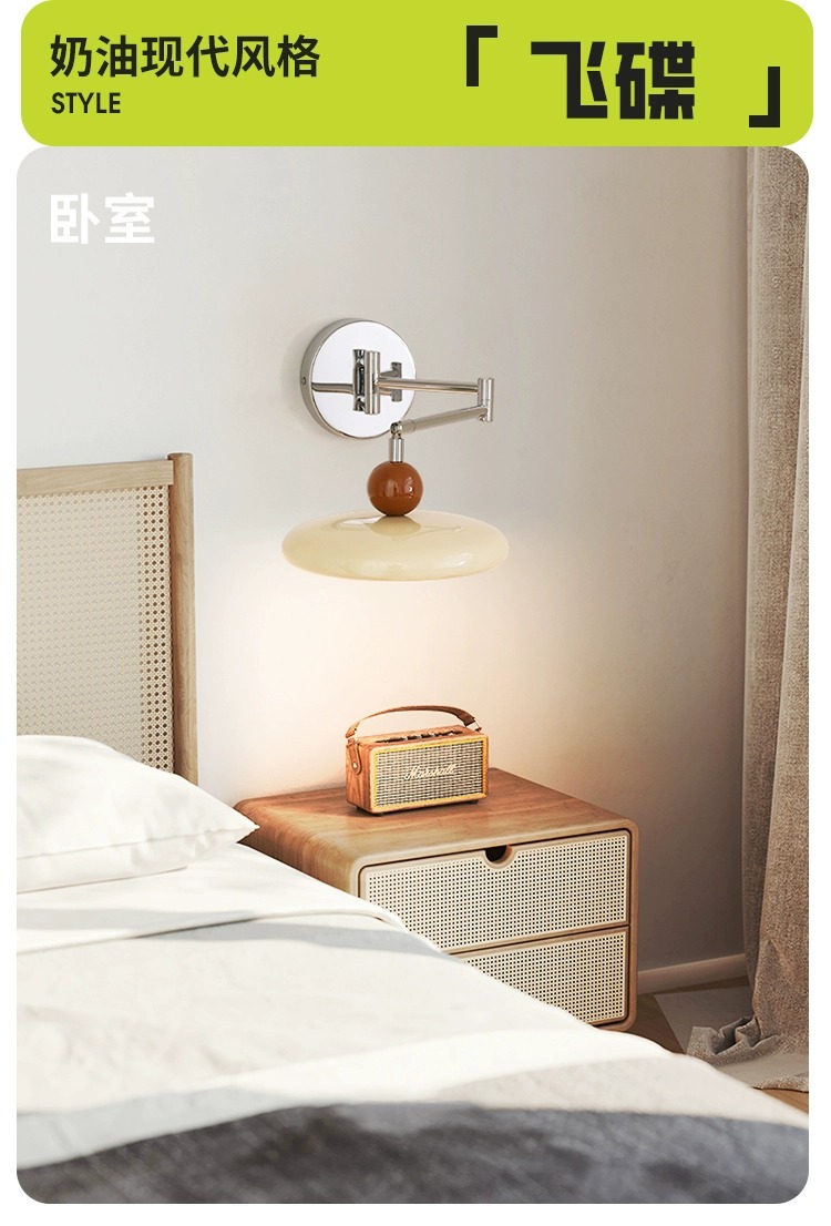 法式奶油风摇臂壁灯卧室床头灯免布线接线中古可旋转长臂护眼灯