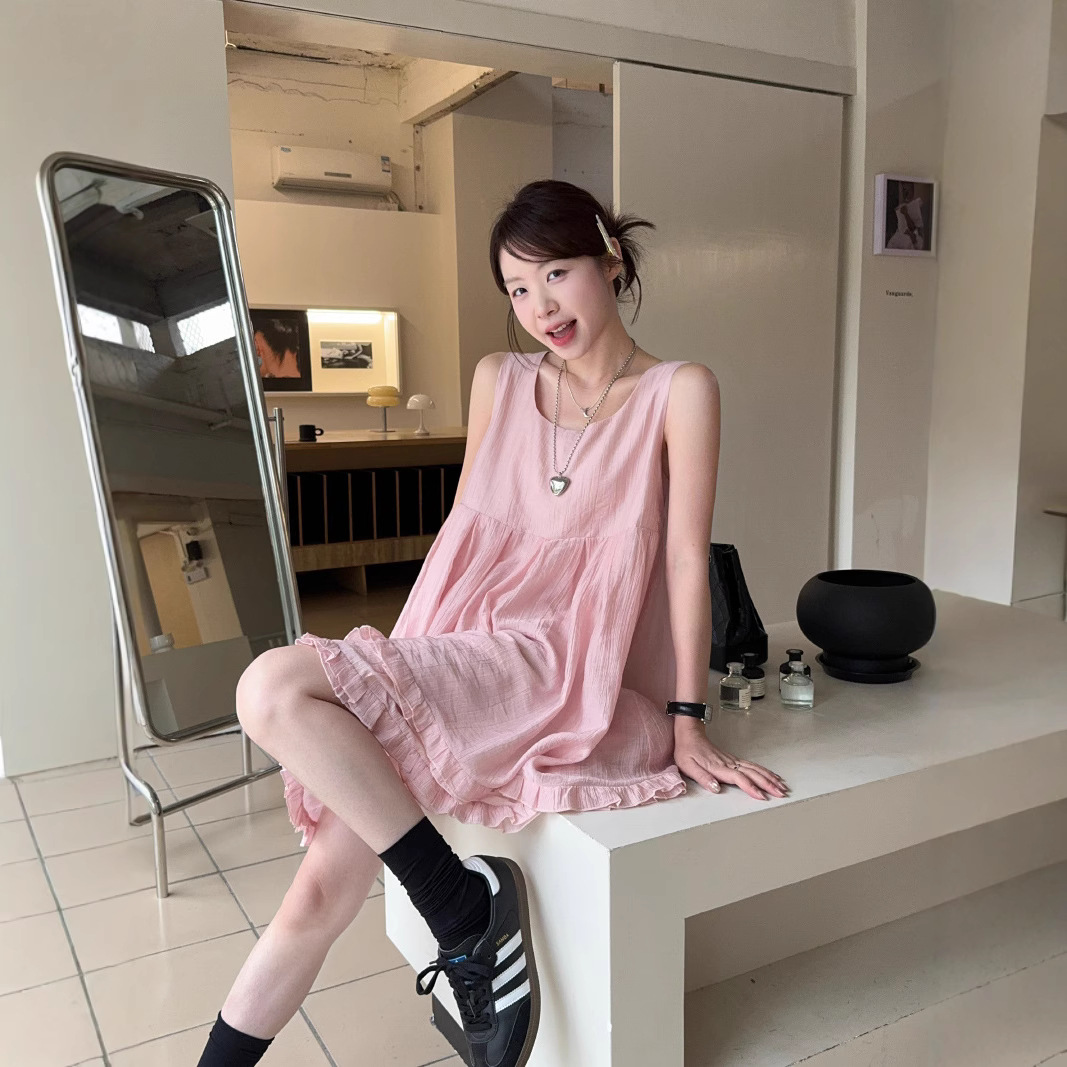 実写デザイン感ピンク二重レースベスト子供スカート女性2025夏ゆるい痩せa字スカート80224