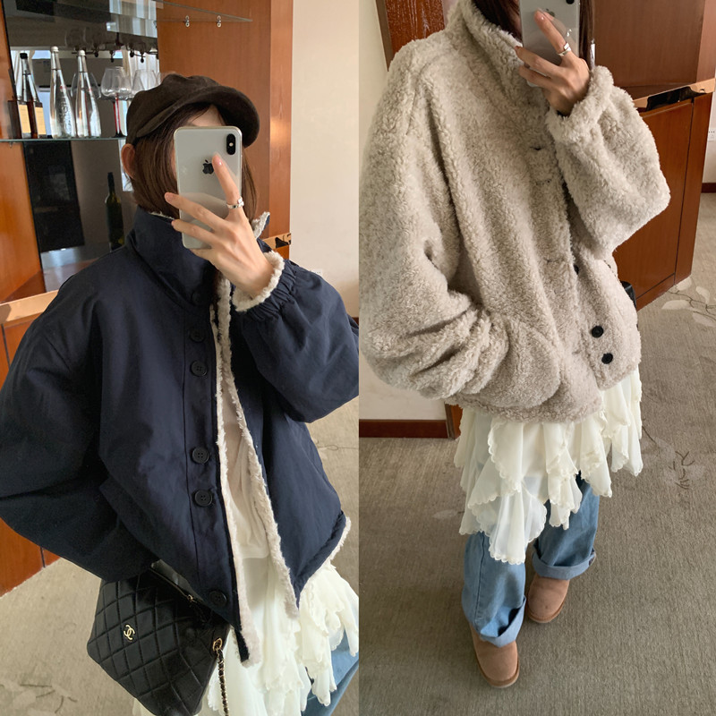 韩版chic小众复古立领羊羔毛单排扣外套双面穿保暖宽松棉服 3色
