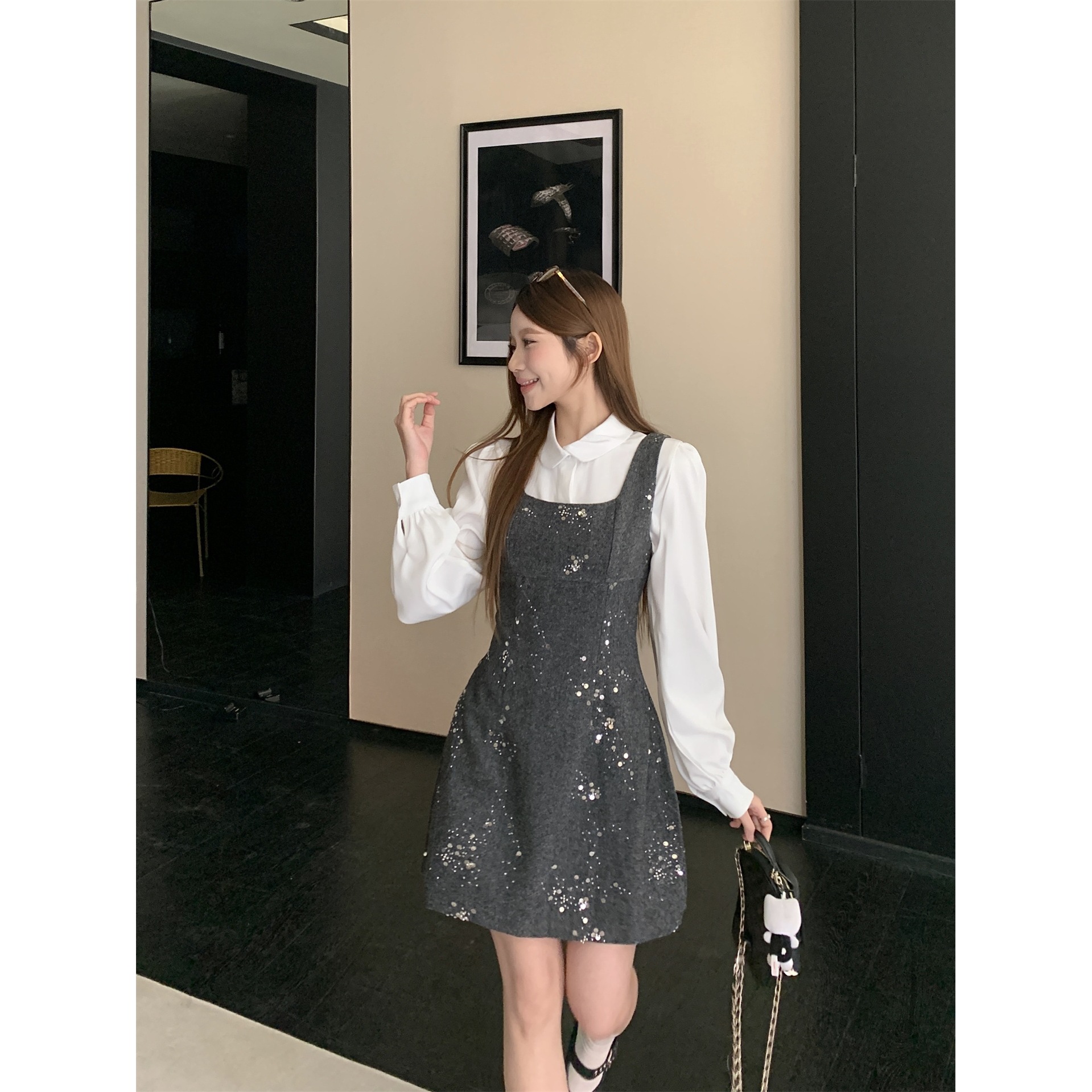 实拍~早春款泡泡袖叠穿翻领衬衣+重工亮片无袖背心连衣裙时尚套装