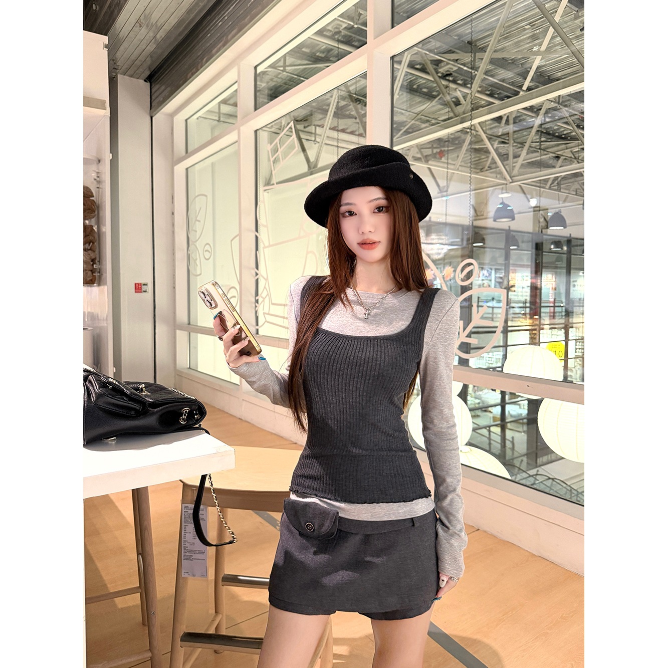 2025冬季新款韩系收腰背心吊带圆领长袖T恤高腰半身裙时尚套装女