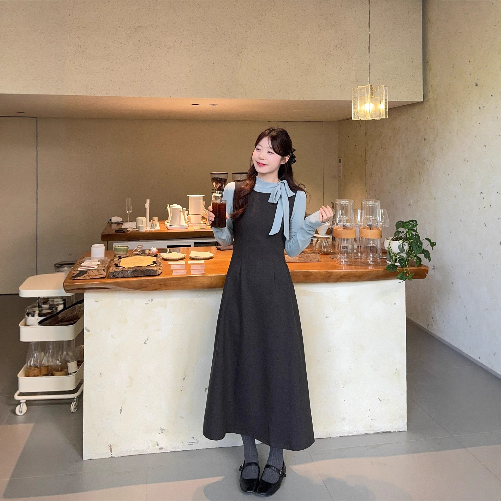 甜美减龄设计感飘带磨毛长袖上衣+无袖背心连衣裙女秋冬套装92362
