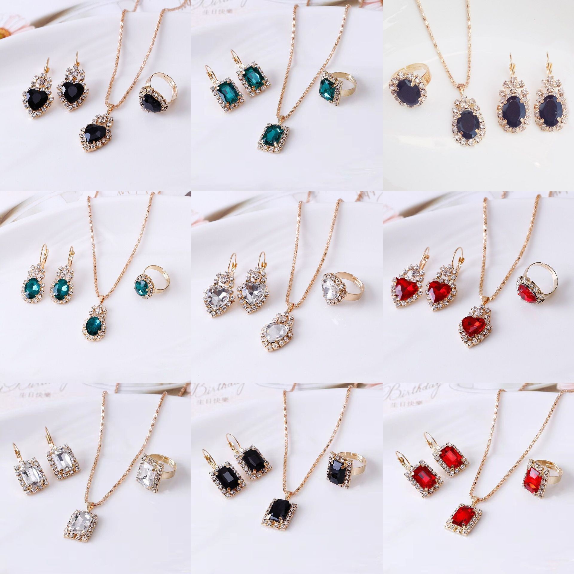 欧美跨境饰品 吊坠耳环戒指镶钻三件套套装时尚新娘装饰套装