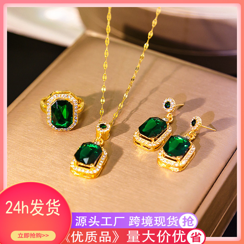 2025新抖音直播锁骨链轻奢祖母绿红色钛钢项链耳钉戒指三件套