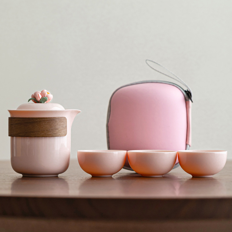 旅行の茶器の便利な工夫の茶器のセットの屋外の旅行の快客の杯のピンクのつまみの花の熱い泡のティーポット