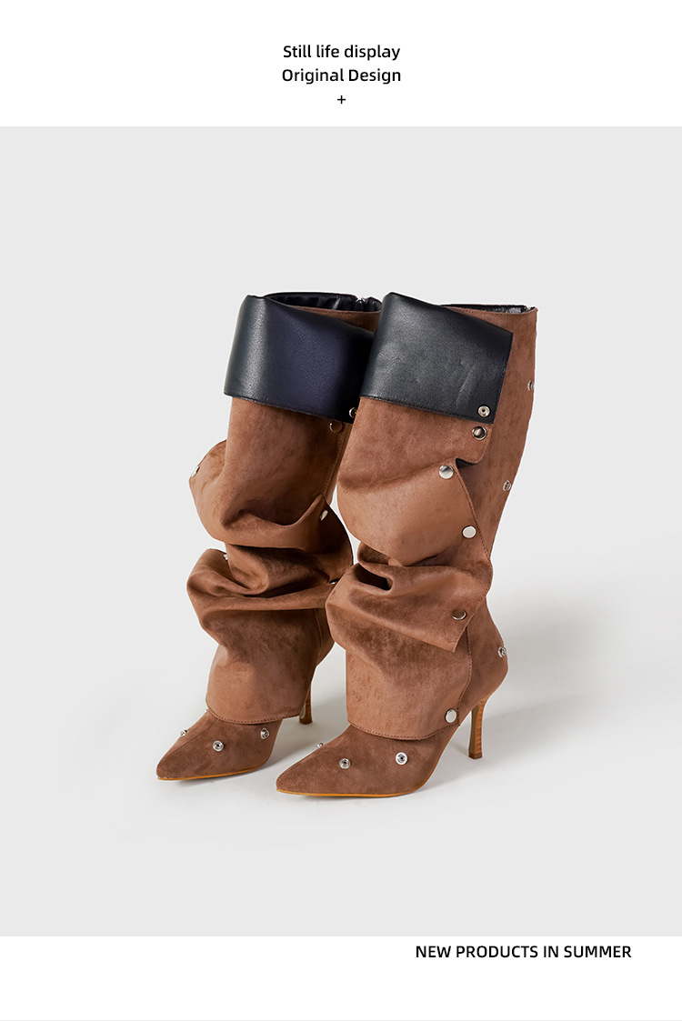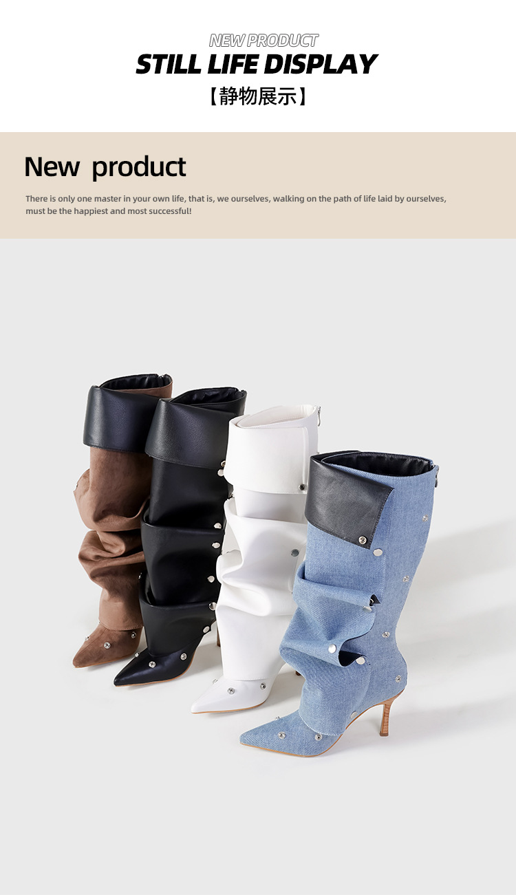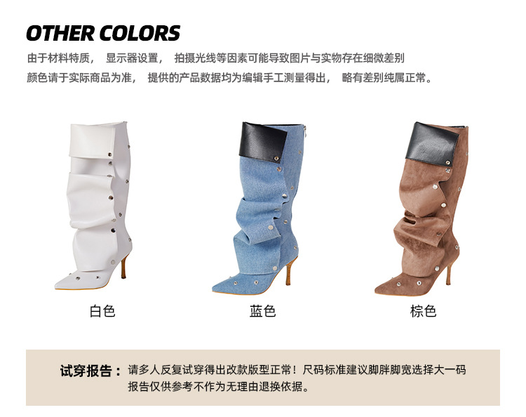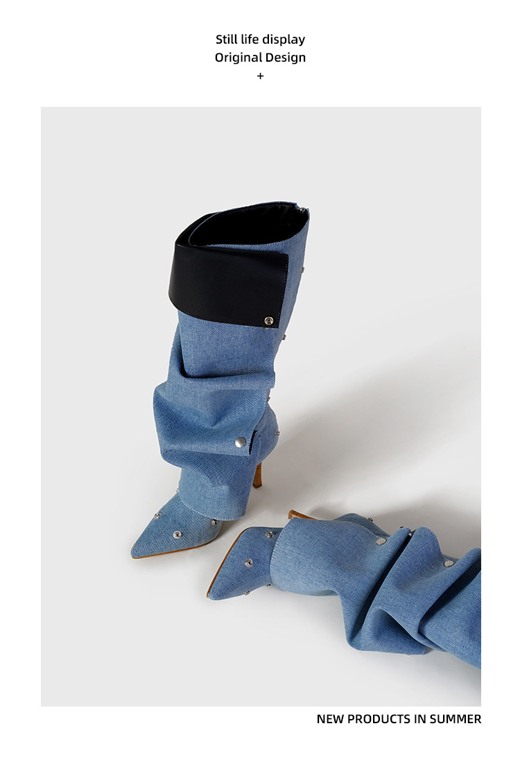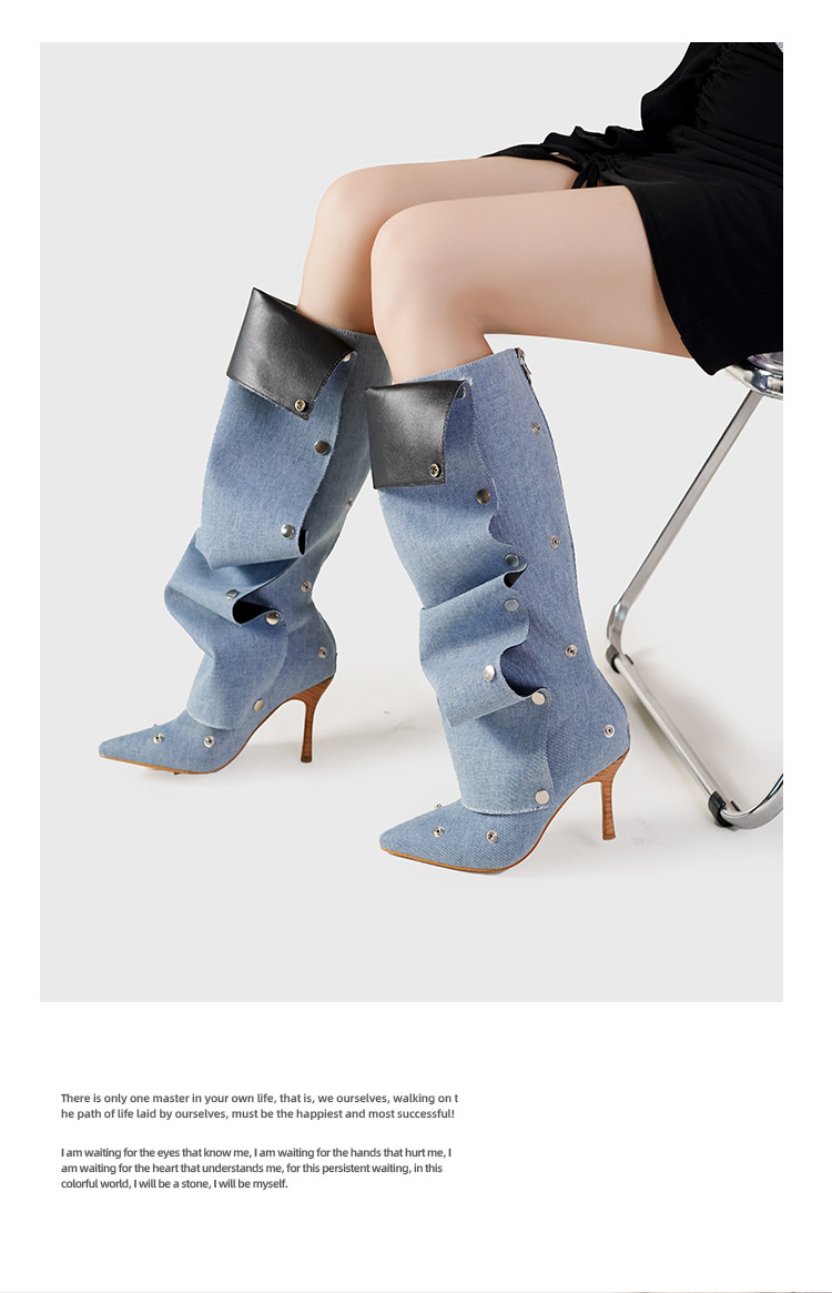 2025 柳の爪バックルスプライシング 2 着用スティレットヒールデニムプリーツパイルブーツ女性のための人格ホットガールファッションブーツ女性のための