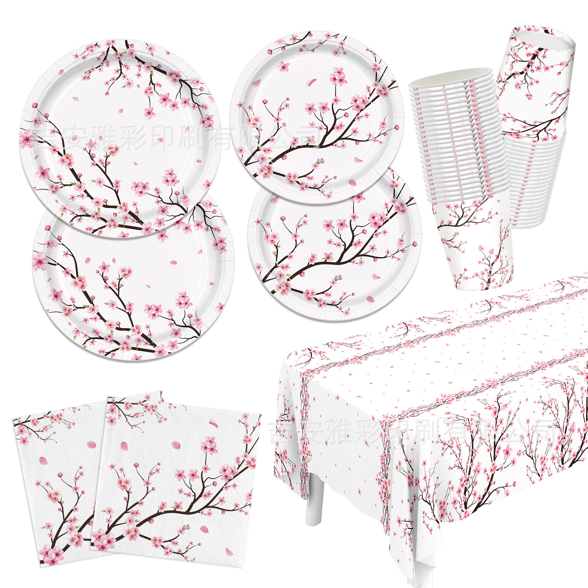 跨境粉色樱花派对装饰用品纸盘纸杯纸巾桌布餐具桃花生日布置套装