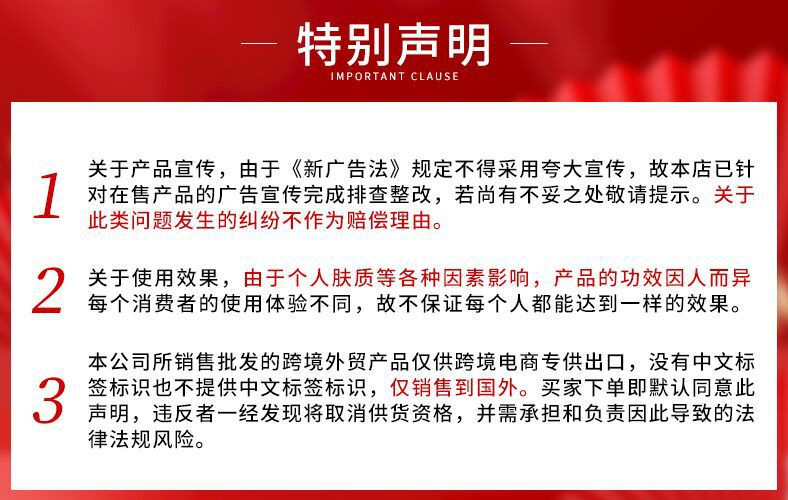 本公司生产的纯英文产品为跨境电商专用,仅销往国外。经销商不得在国内销售,如有违反,一经发现将取消供货资格,并且自行承担所导致的法律法规风险和后果。The Enqlish products by the company are exclusively for cross-border e-commerce andare only sold abroad. Distributors are not allowed to sell in China, and if they violate it,they will be disqualified from supplying once discovered, and they will bear the risks andconsequences of laws and regulations.