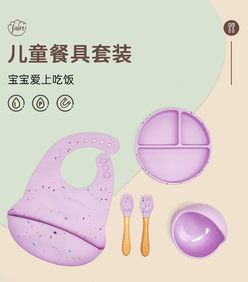 跨境食品级硅胶防摔吸盘式餐盘饭碗叉子勺子围兜硅胶儿童餐具套装