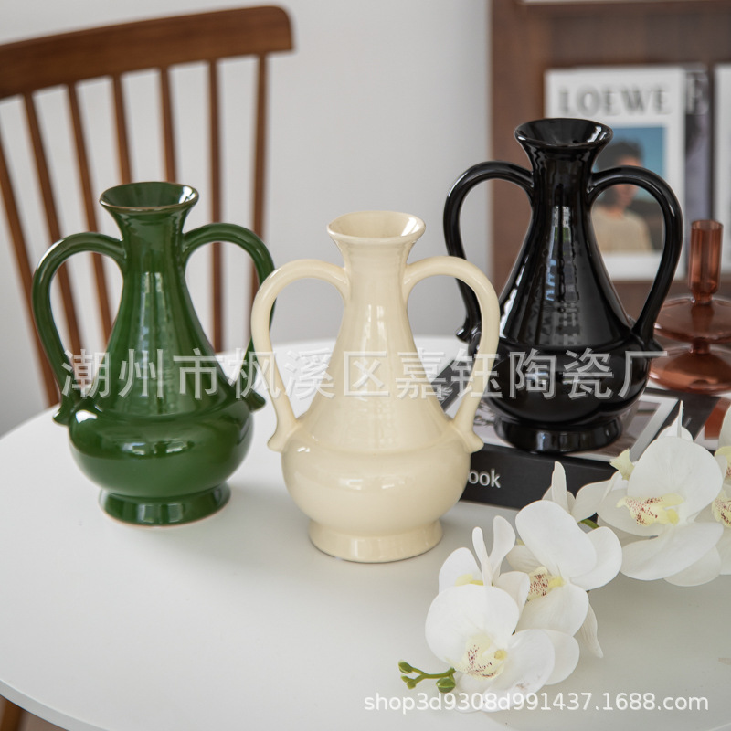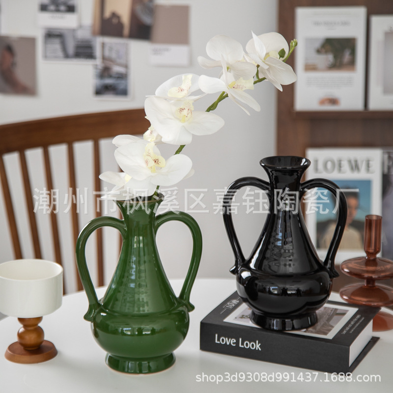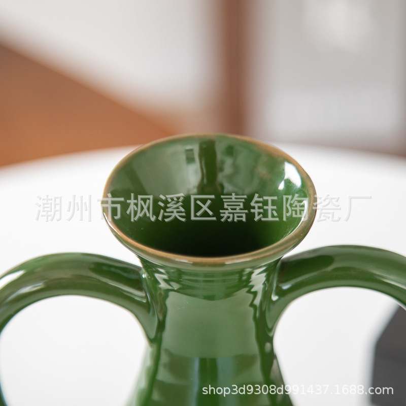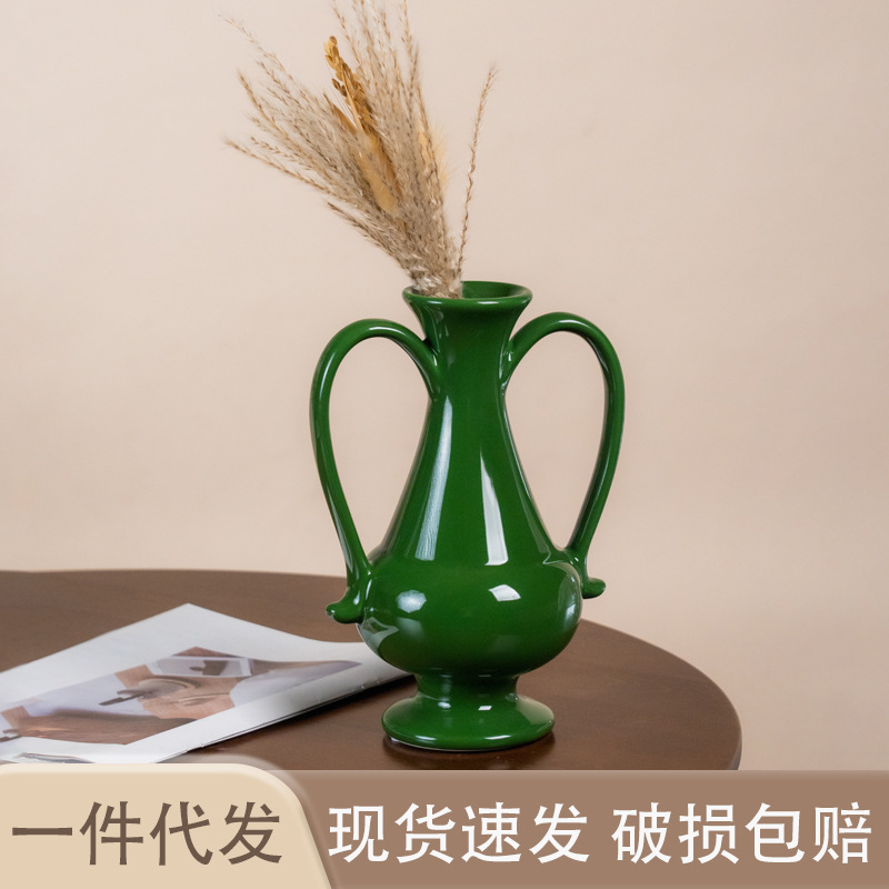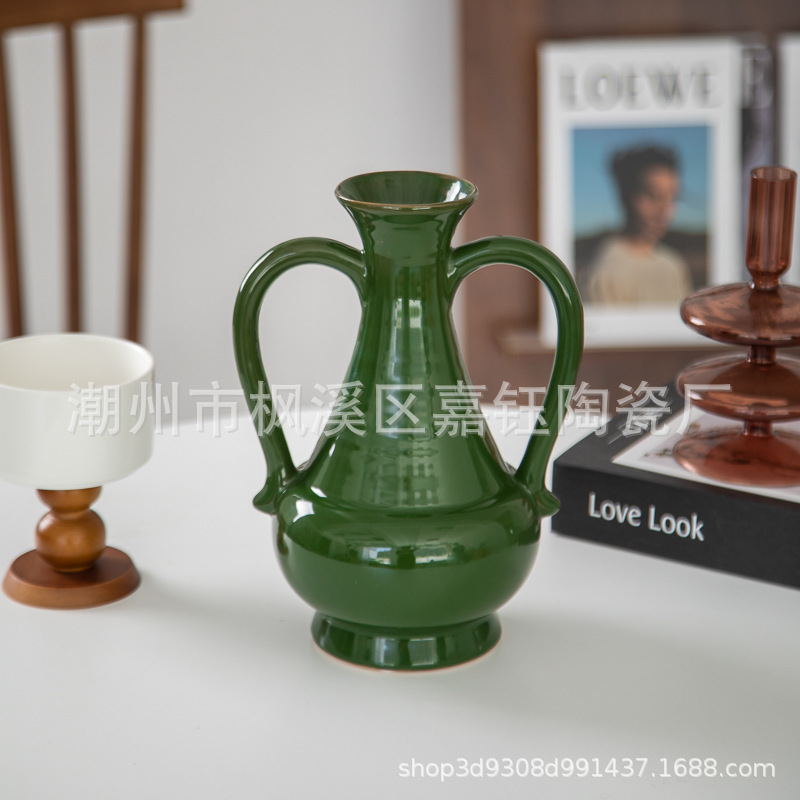 ヴィンテージ風エメラルドセラミック両耳花瓶 北欧風インスタ映えフラワーアレンジメント用卓上装飾工芸品
