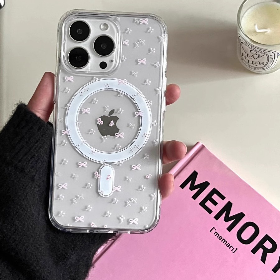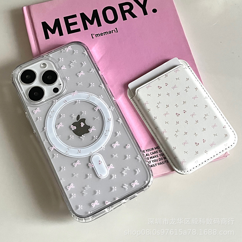 バレエ風リンゴ15磁気吸引携帯ケース14pro maxはピンクの蝶ネクタイmagsafeカードを適用して皮質を包む