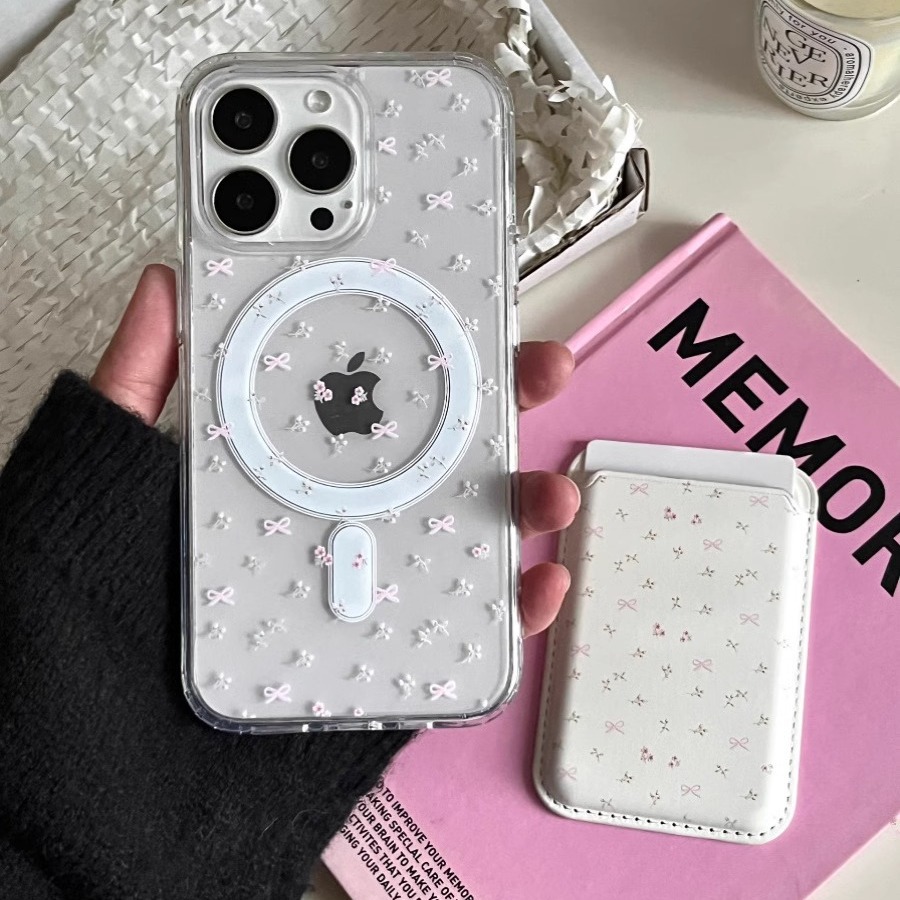 日本と韓国に適した iPhone16ProMax Apple 13 リボンフラワー磁気カードホルダー PU レザー携帯電話ケース 14