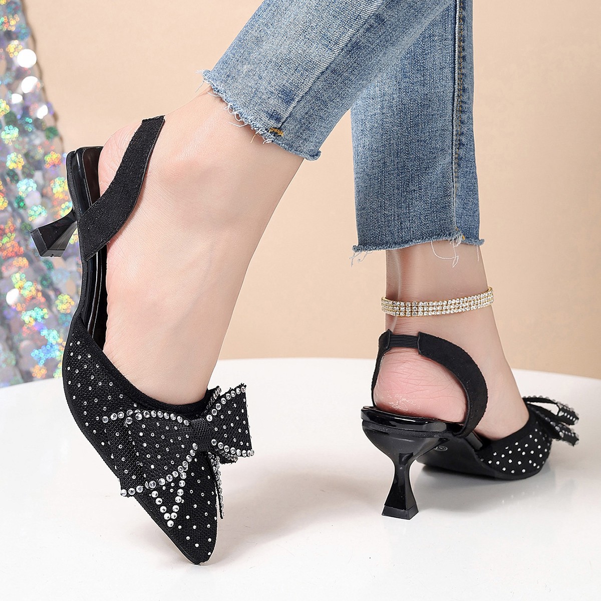 卸売りの大きいサイズの女性靴の年の春夏の後で空のサンダルの外国貿易の新型の頭の2025蝶結びのハイヒールの女性のドリルの包み