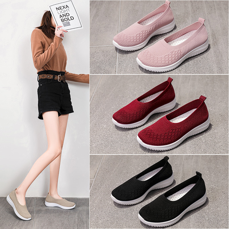 春と夏の女性向けの新しい柔らかく快適なローヒールカジュアルラウンドトゥシューズ、合わせやすいカジュアルシューズ、大きいサイズのフライウーブン通気性のある女性用シューズ