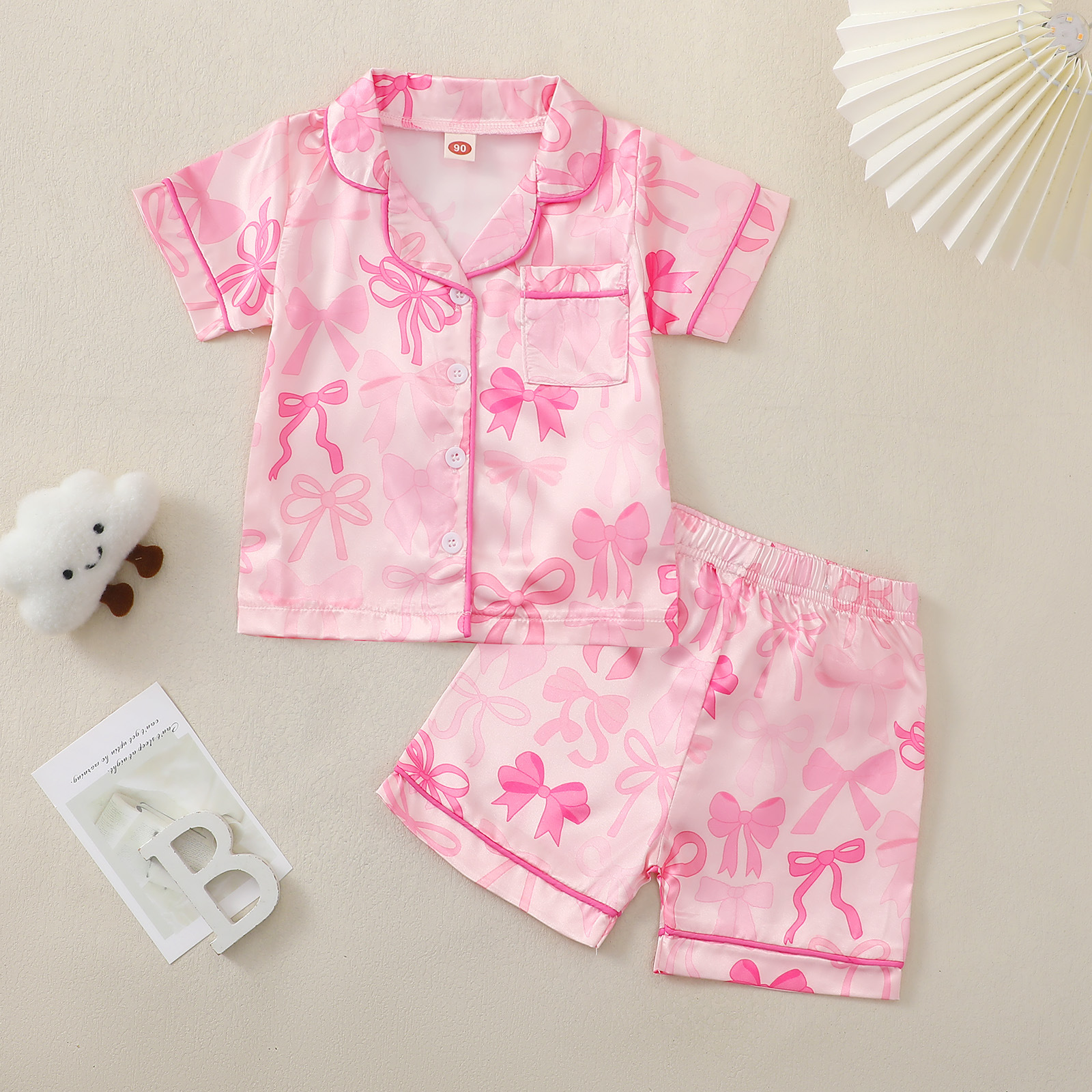 子供用パジャマセット夏ピンク蝶結びプリント女の子ホームウェア2点セット子供服半袖折り襟