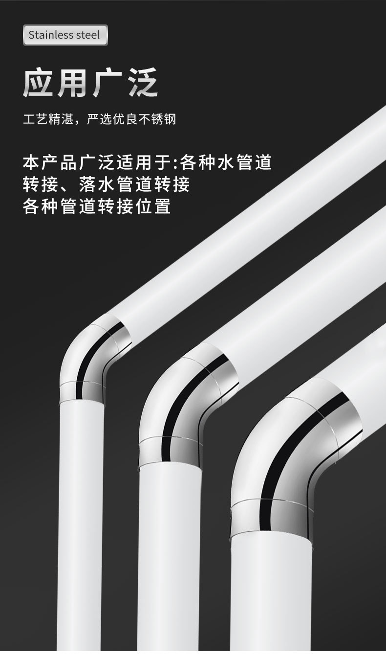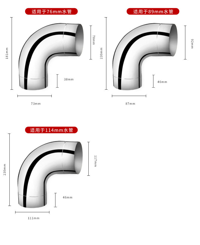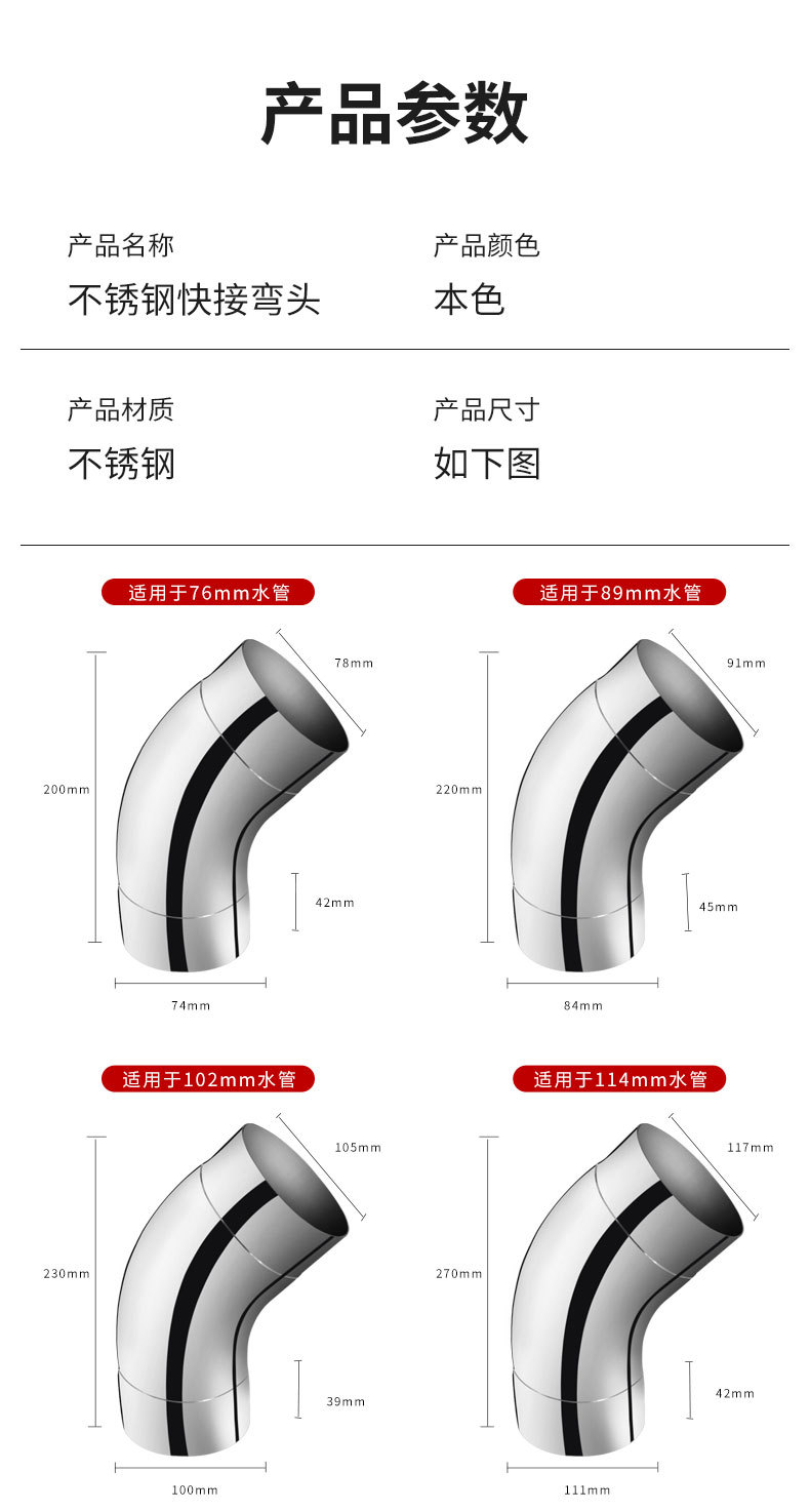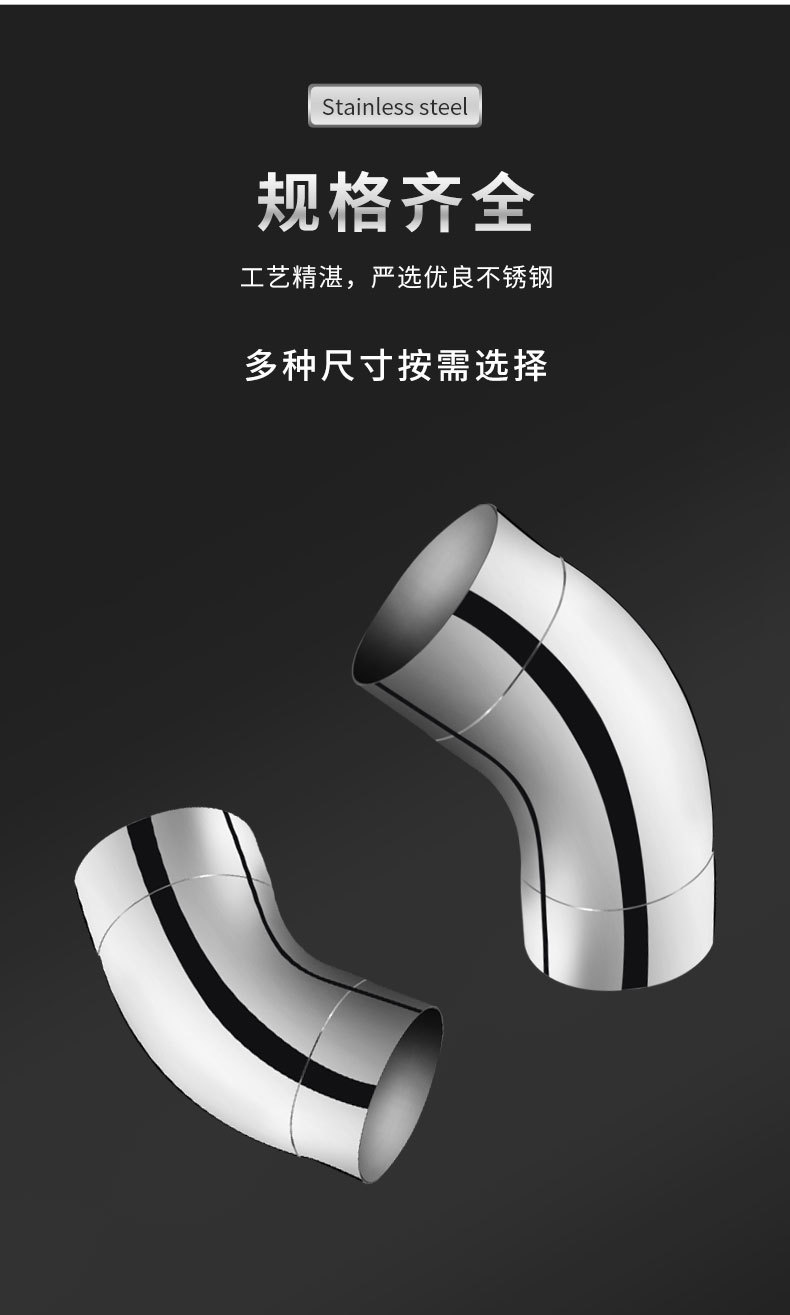 製品仕様 45度76mm201材質,45度76mm304材質,90度76mm201材質,90度76mm304材質,45度89mm201材質,90度89mm201材質,45度102mm 201材質,45度102mm 304材質,90度102mm 201材質,90度102mm 304材質,45度114mm201材質