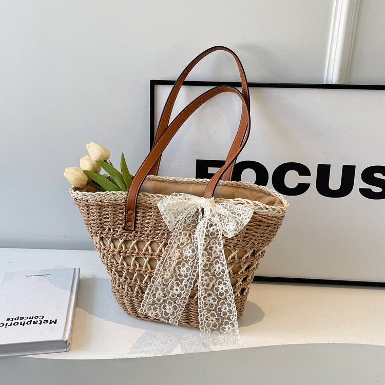 田園風大容量手作り草編みバッグ2024夏新作蝶結びショルダーバッグ