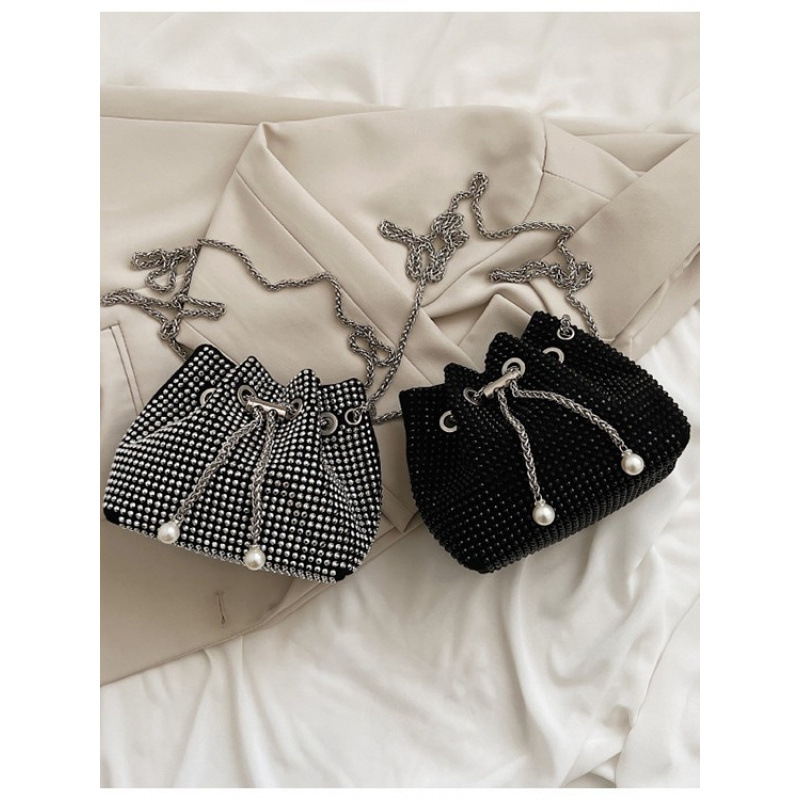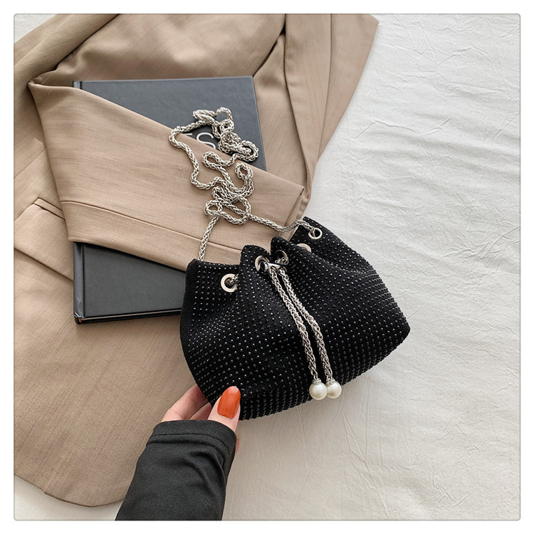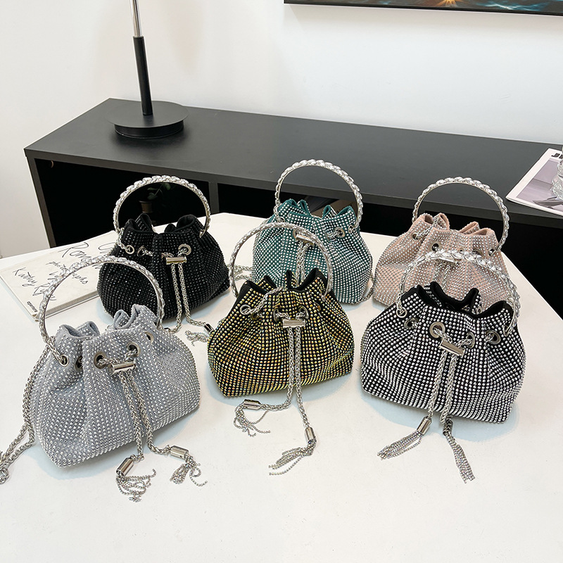 ダイヤモンドがちりばめられた巾着式のイブニングバッグ、女性用フルダイヤモンドのクロスボディバッグ、個性的で汎用性の高い女性用キラキラチェーン付きバケットバッグ