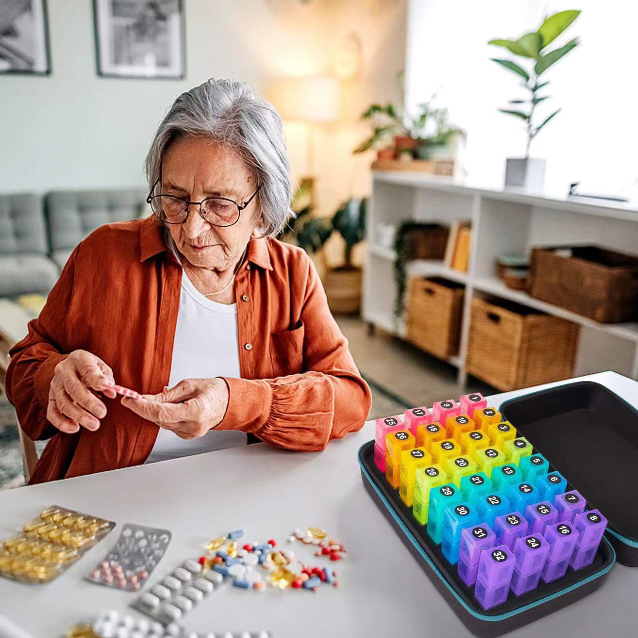 1ヶ月31日分、朝・昼・夕・就寝前の4回に分かれた毎日の薬箱、防湿・超密封の薬の仕切り箱収納
