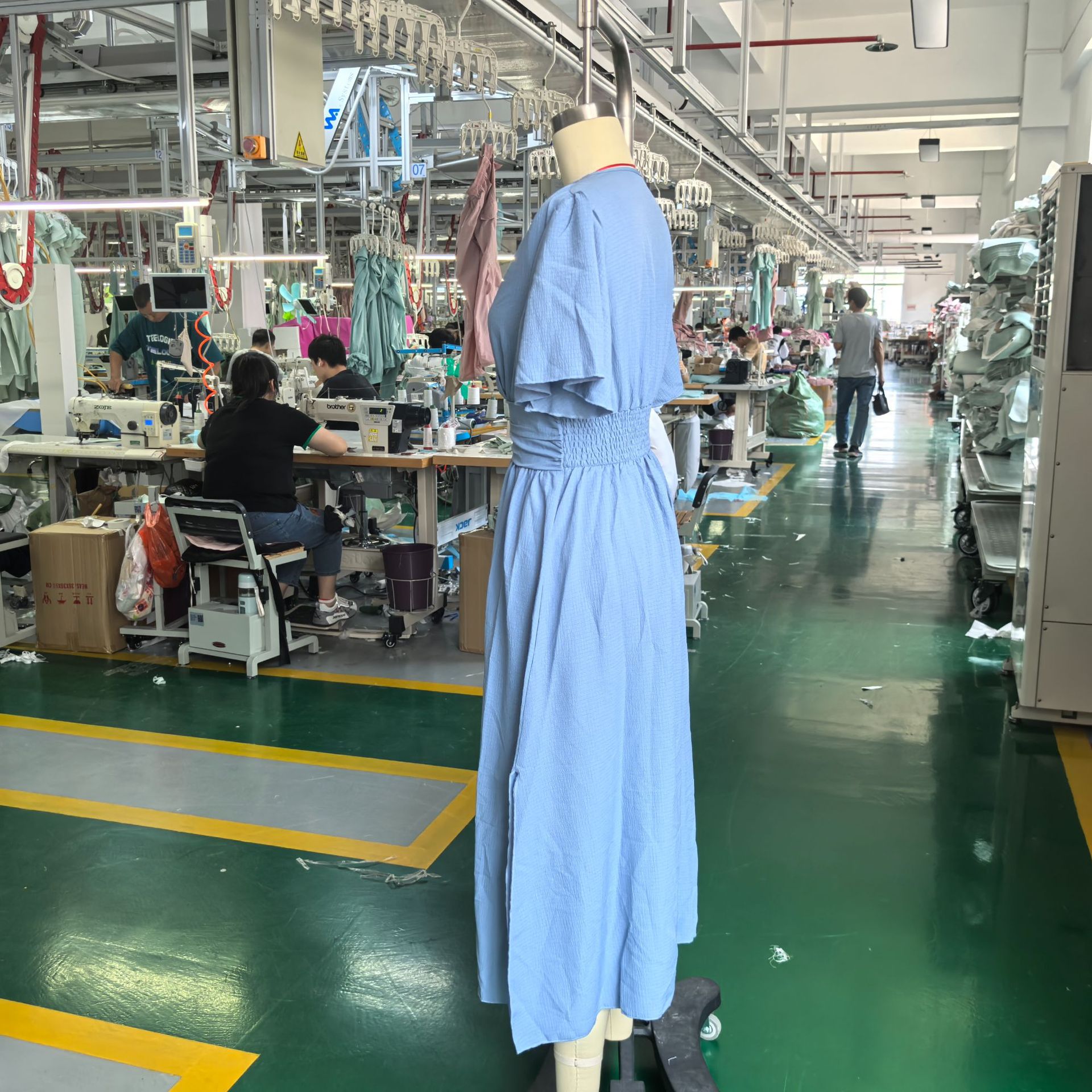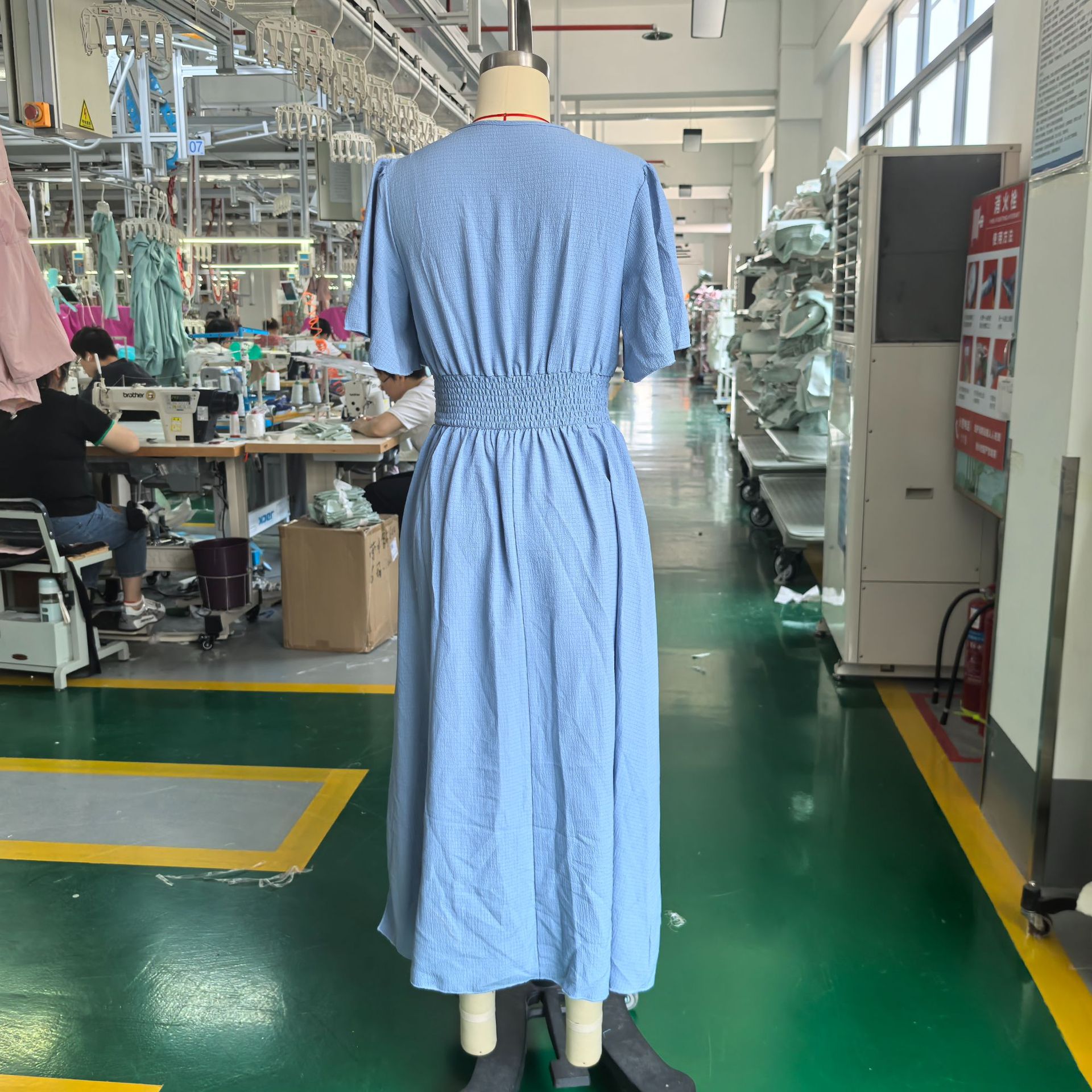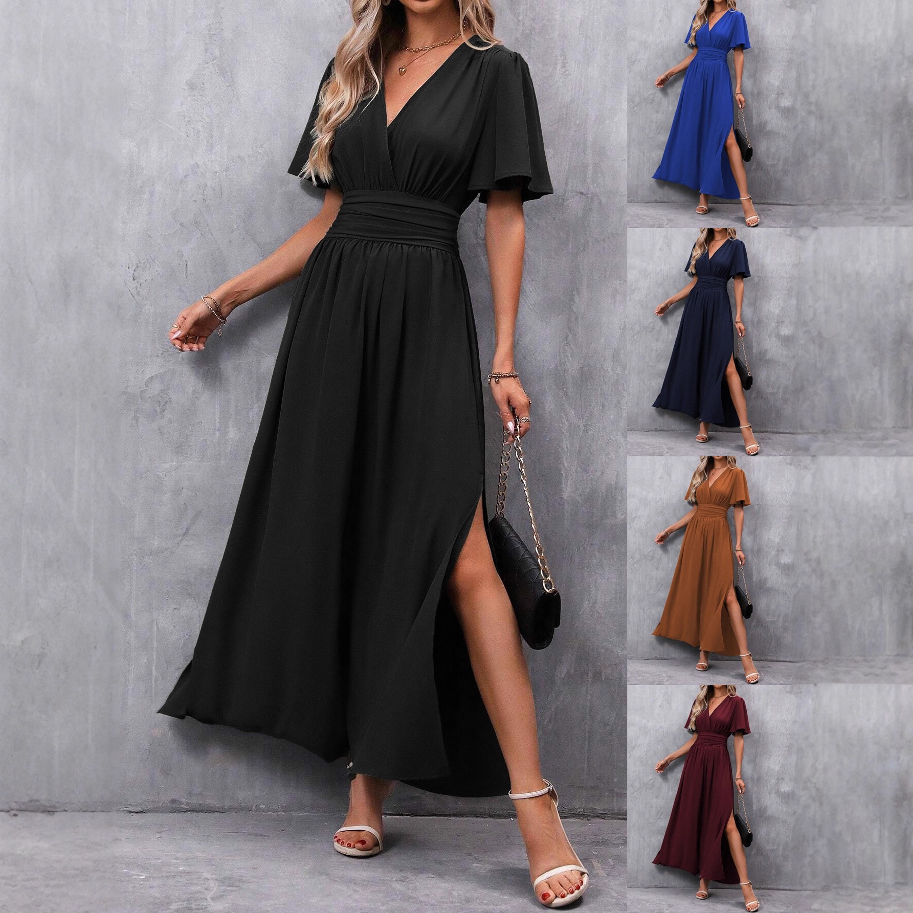 海外貿易向け、欧米風エレガントなドレス、後ろでギャザーを付けたハイカットスリット入りワンピース、レディース新作、着痩せ効果のあるおしゃれなロングドレス