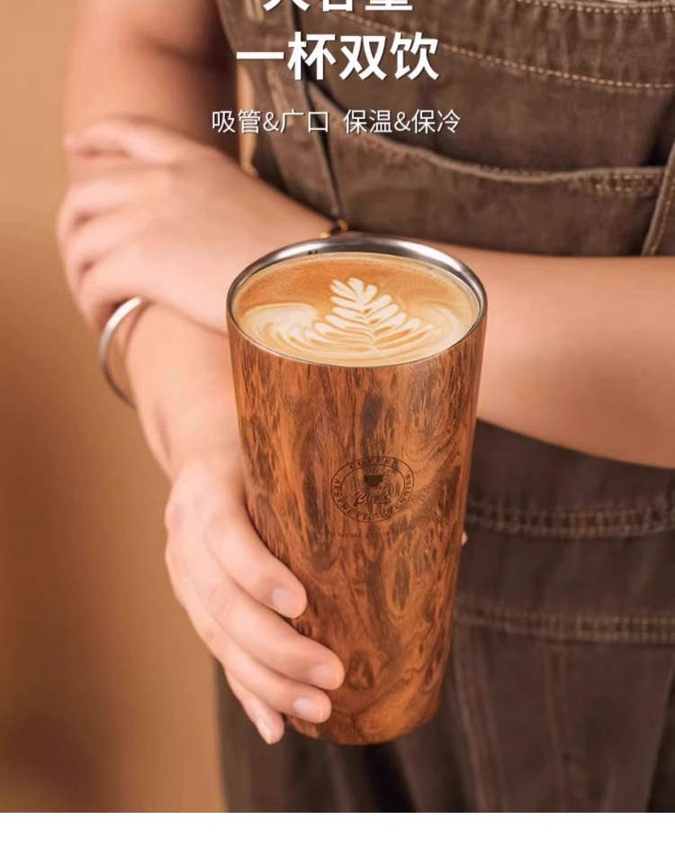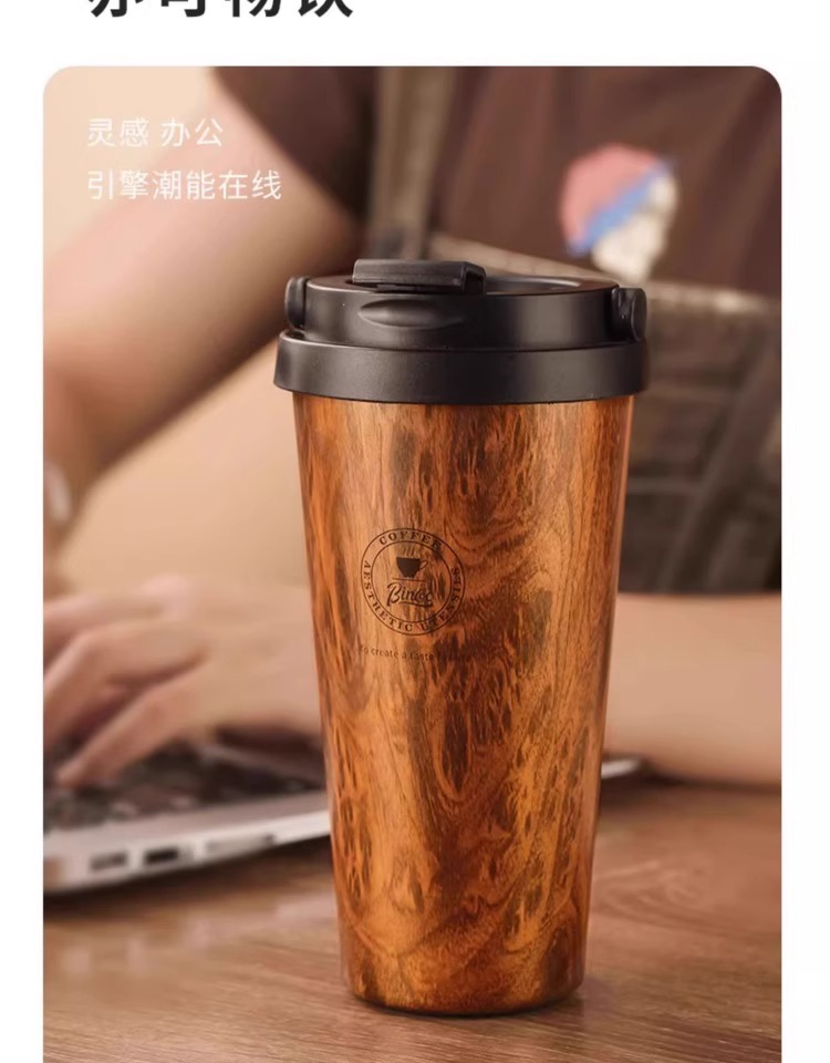 Bincoo木目コーヒーカップ高颜値保温カップ女性車載随行カップ携帯カップ500mlダブルドリンク