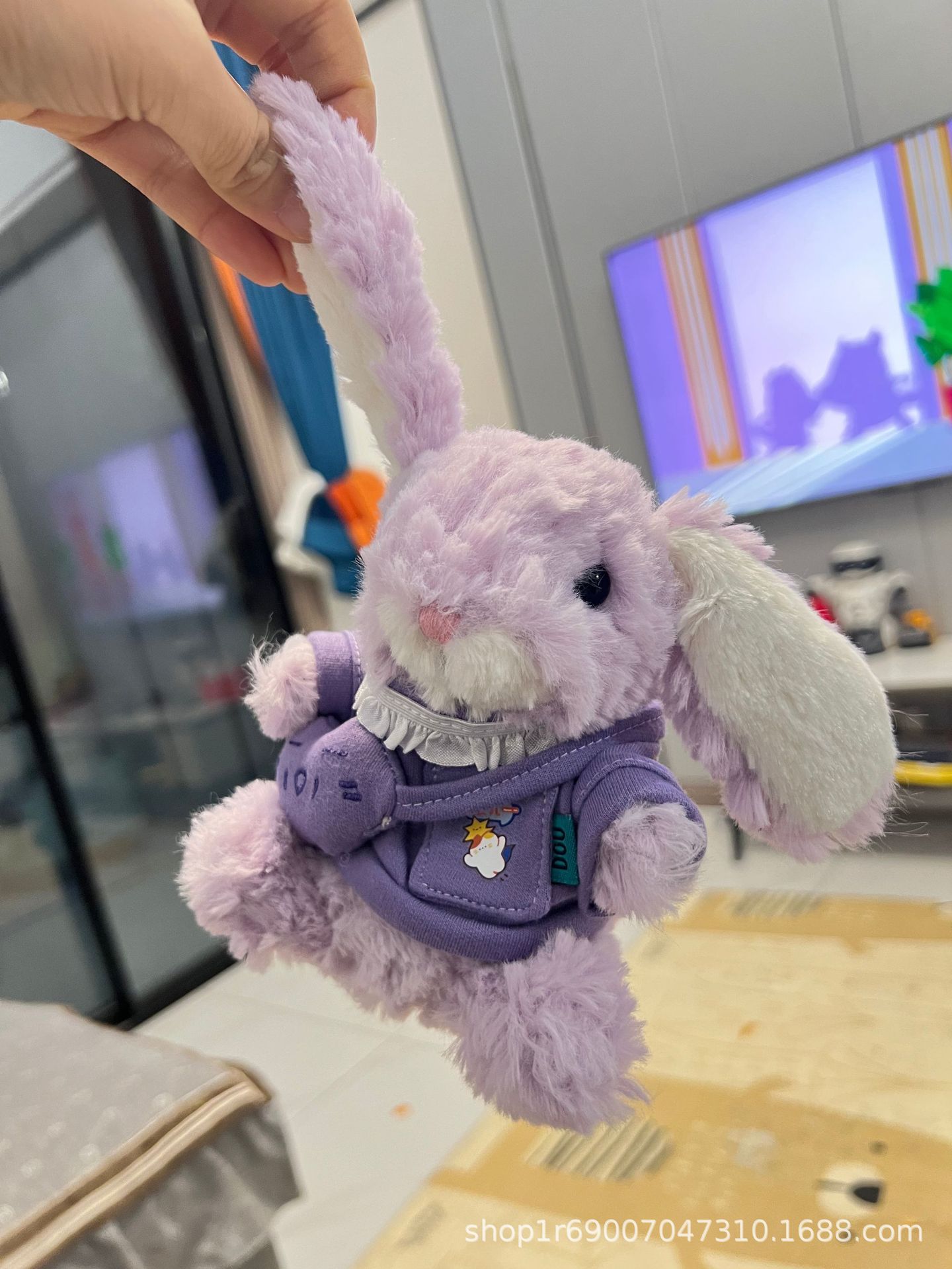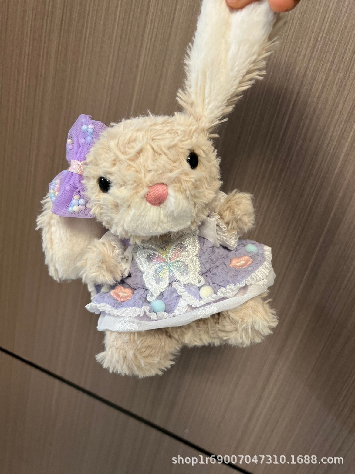 ウサギのぬいぐるみのキーホルダーにウサギのカップルのカバンを掛けて、誕生日プレゼントを飾っています。