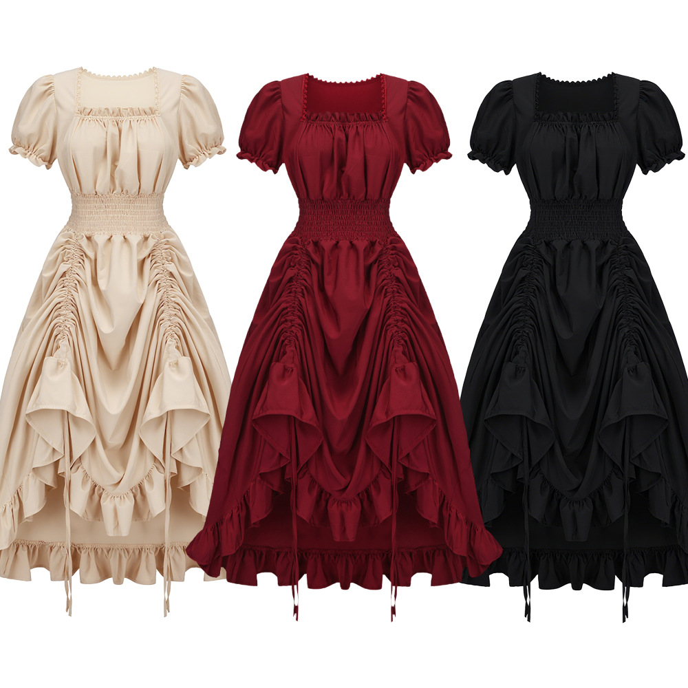 亚马逊跨境复古法式文艺复兴方领短袖连衣裙中世纪cosplay连衣裙