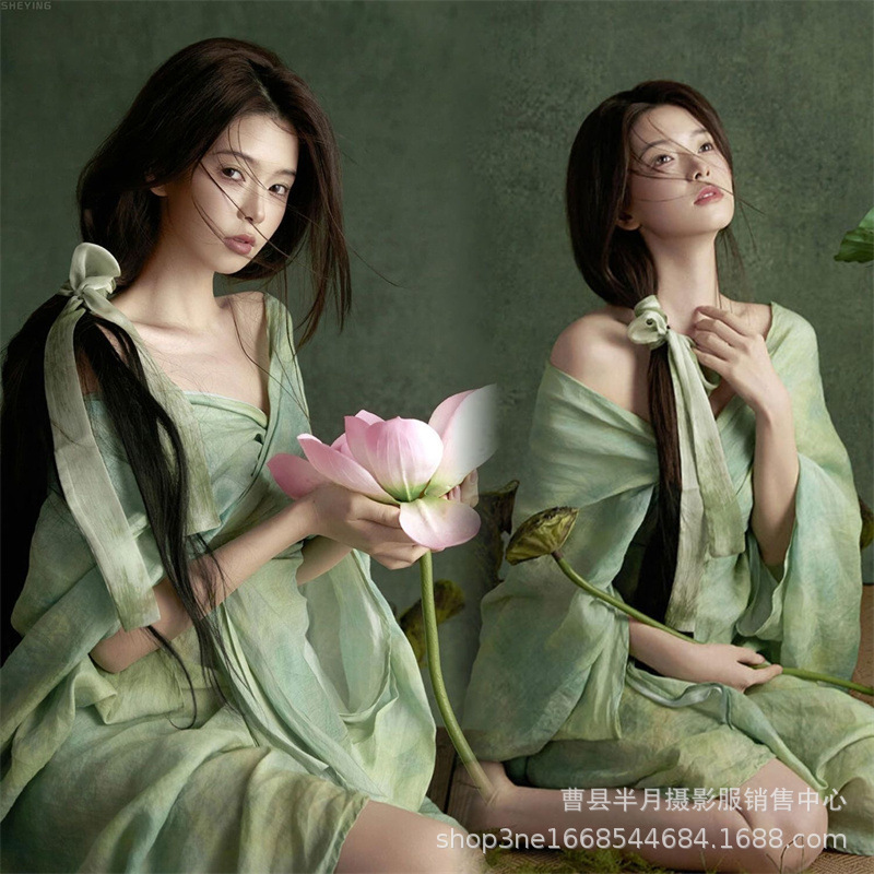新型新中国式テーマ映画館中国風禅意清冷感ぼかし染めワンピース芸術写真個人写真服