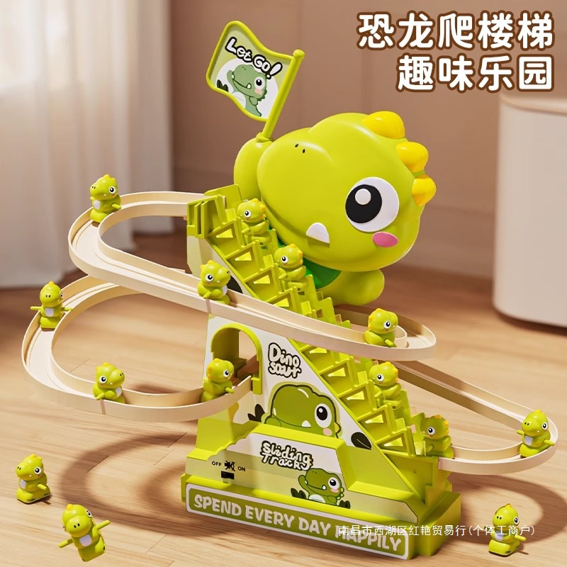 子供の恐竜は階段に登って子供の電動軌道の1歳の女性の男の子の覇王竜のおもちゃの滑り台を登ります。
