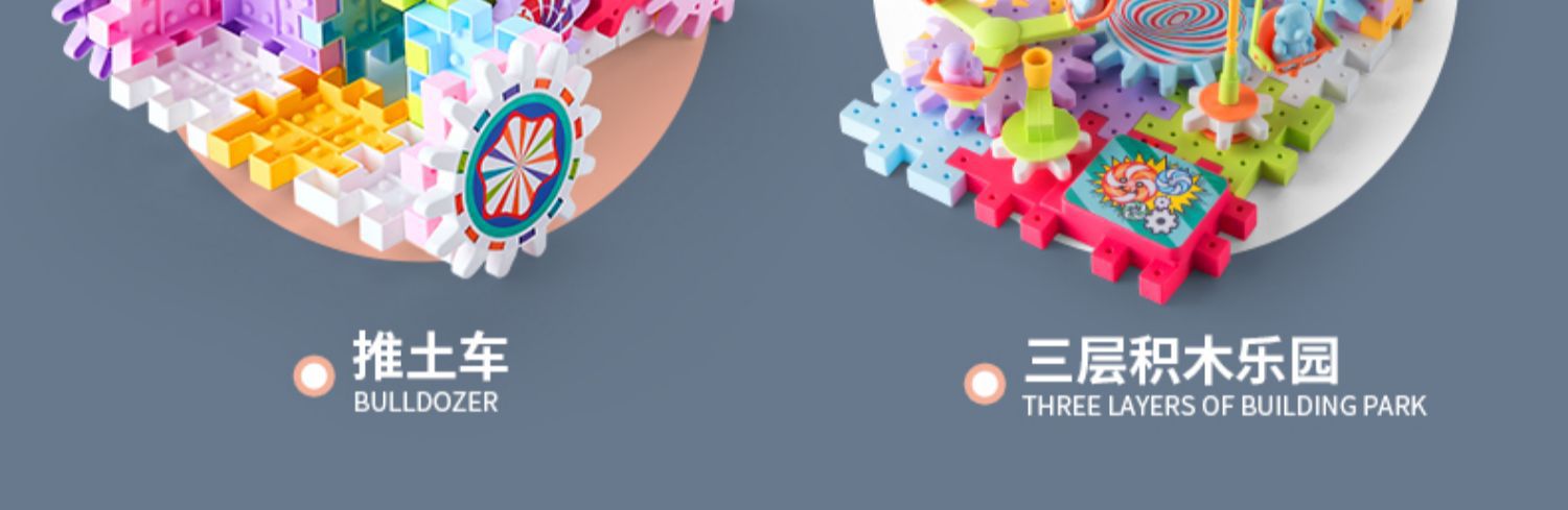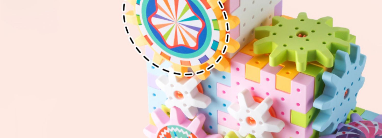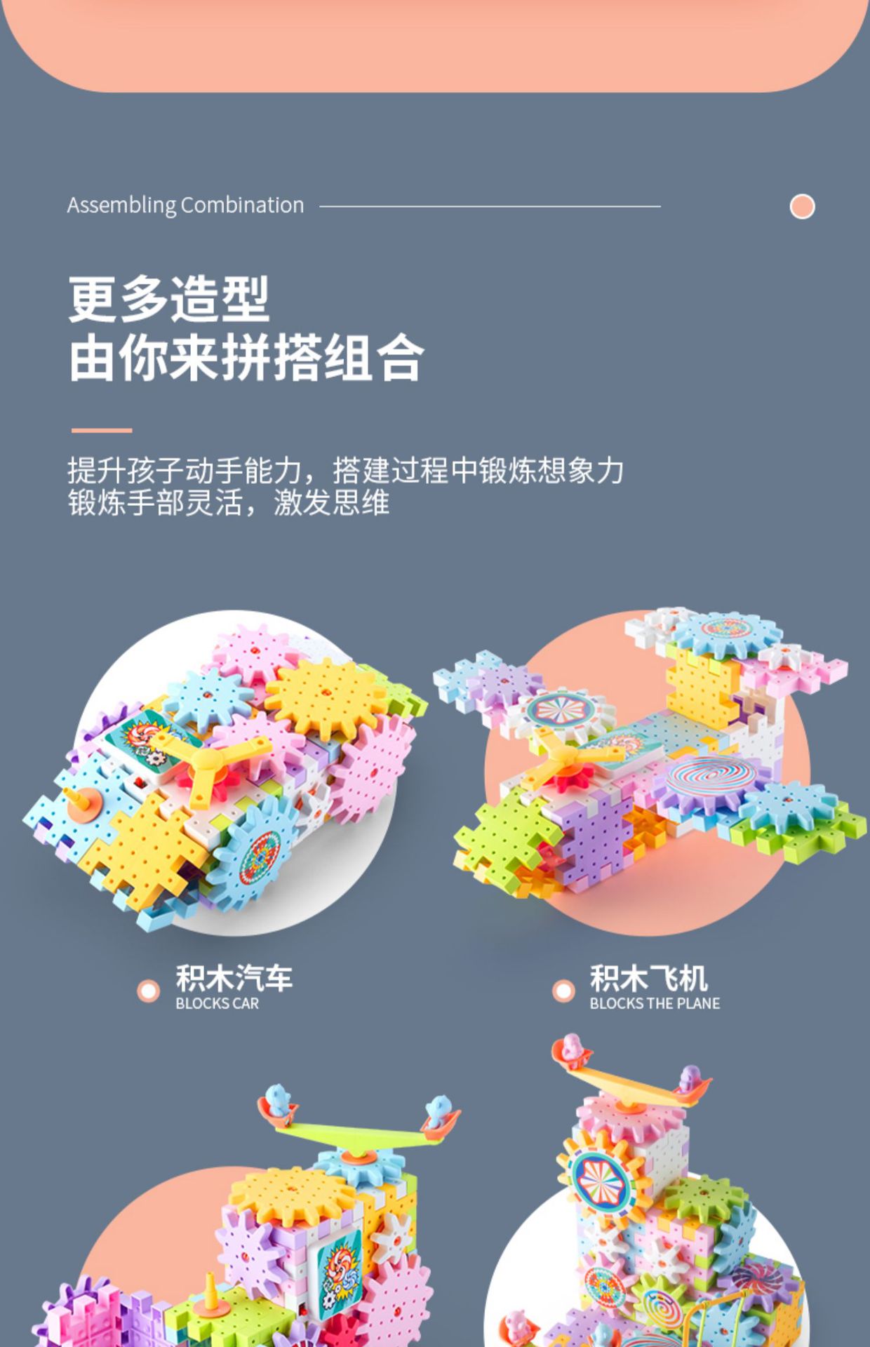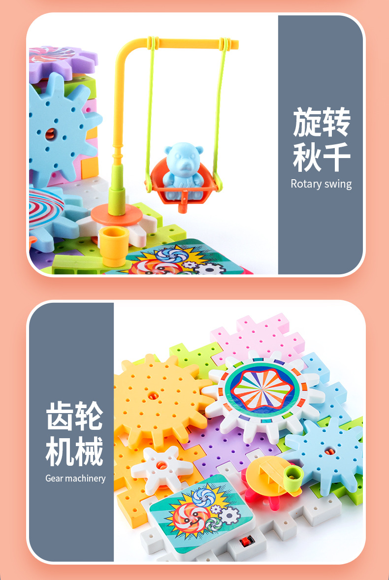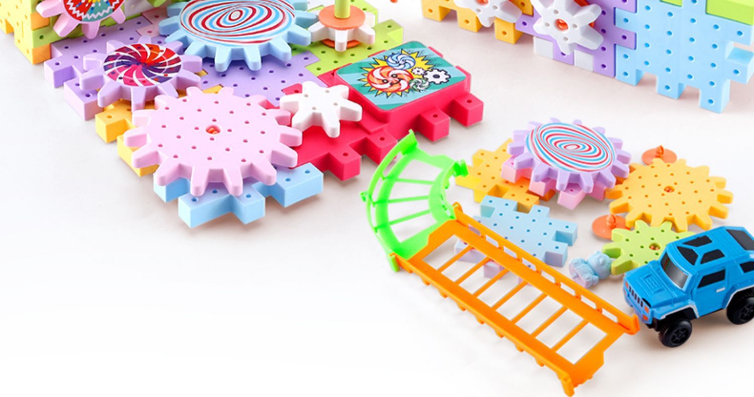 電動の積み木の歯車は大きい粒を挿しておもちゃのセットを詰めます。