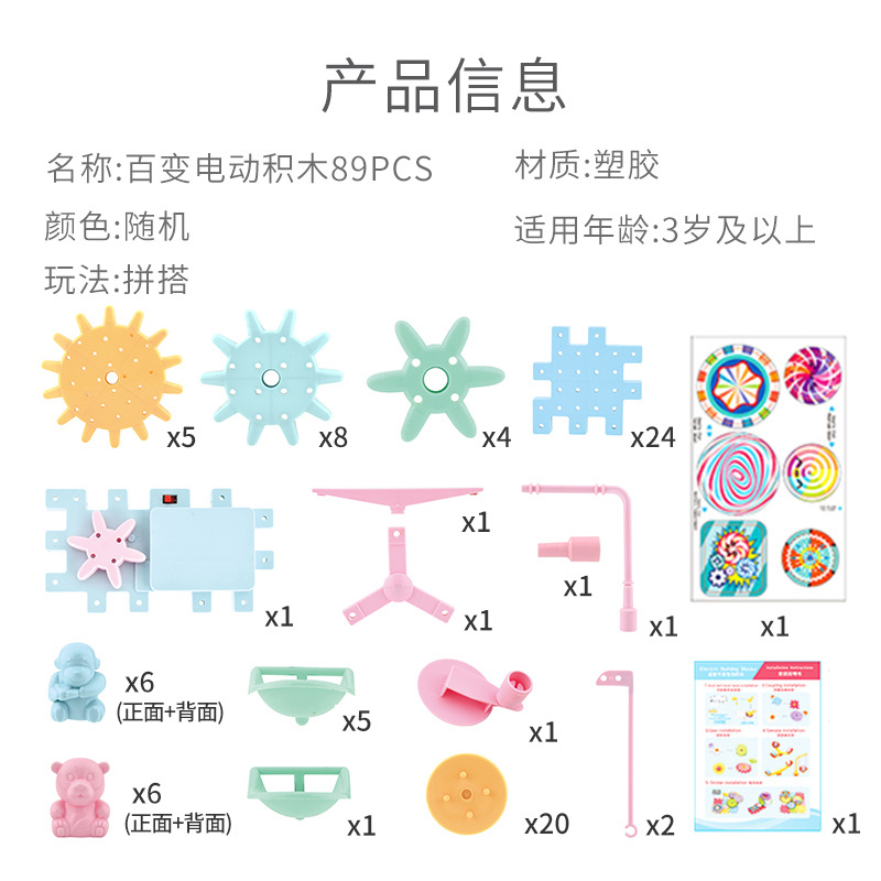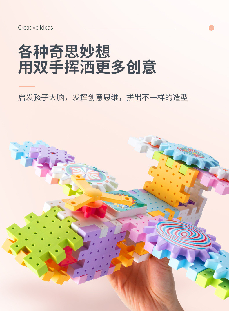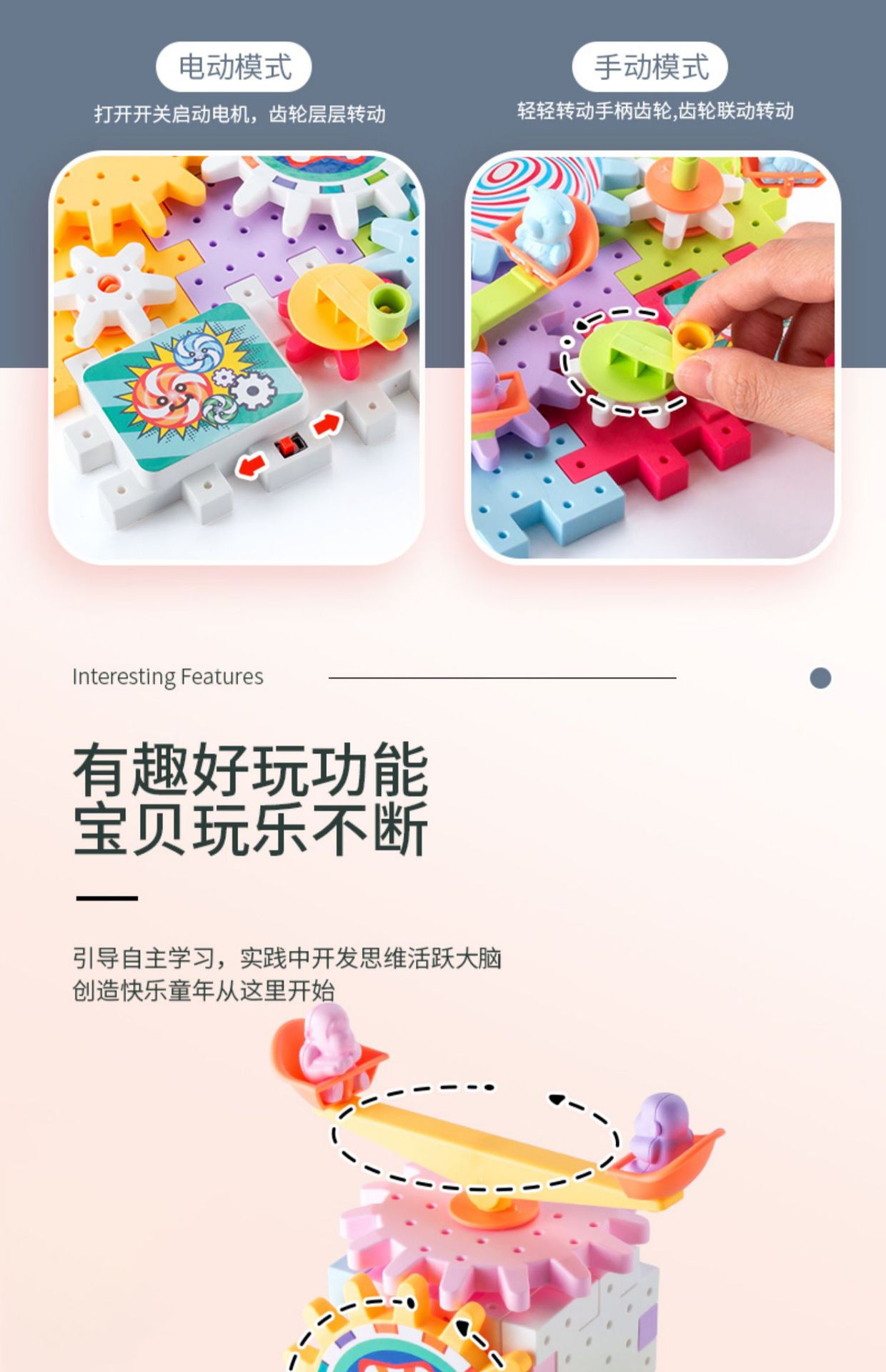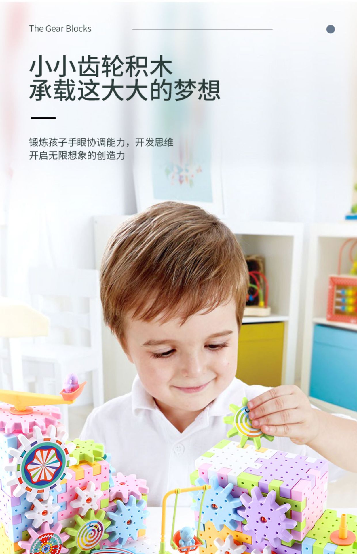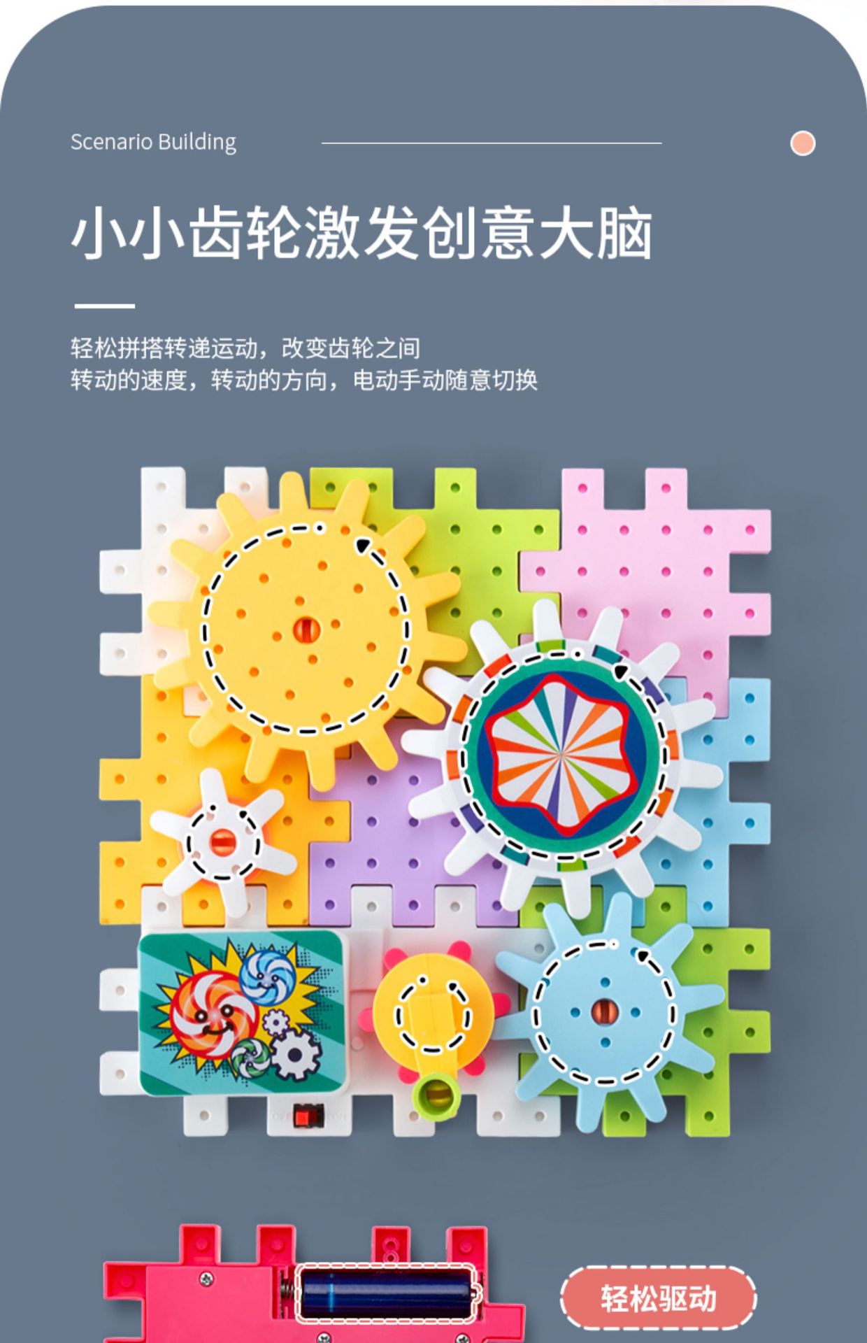 電動の積み木の歯車は大きい粒を挿しておもちゃのセットを詰めます。