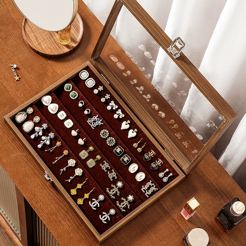 耳饰首饰品收纳盒木质大容量耳钉专用收纳盒黑胡桃纹高级感展示盒