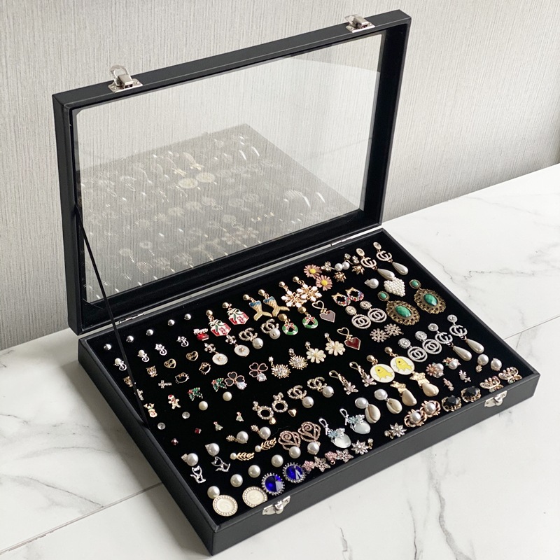 Pu黒革ジュエリーボックスアクセサリー展示ボックス蓋付き透明防塵指輪イヤリングネックレスブレスレット収納ボックス
