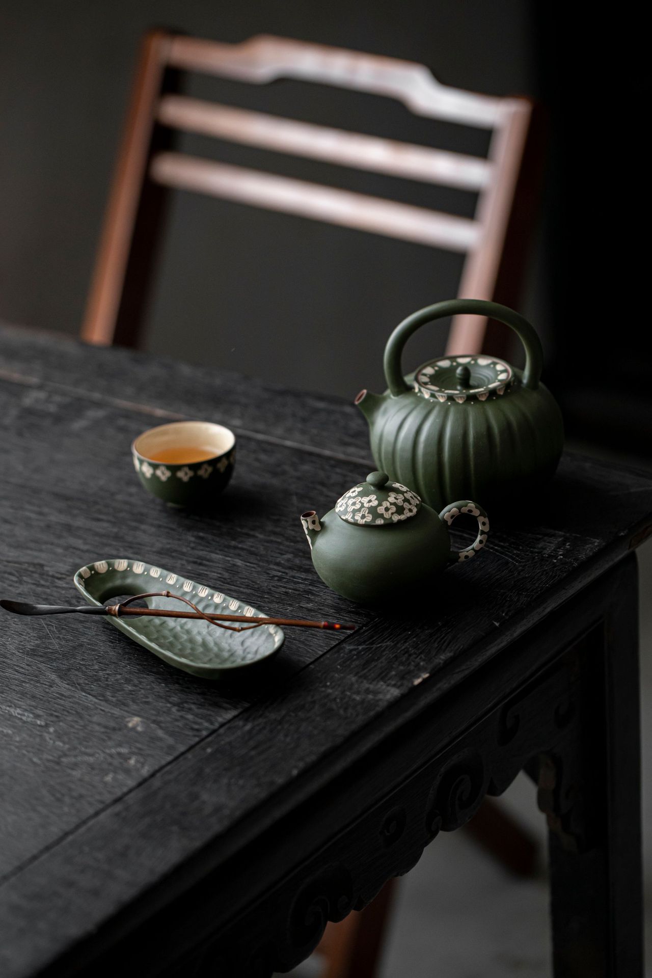 色跡の手作りの色釉の工夫の茶器の3才は碗をかぶせてお茶を入れます。