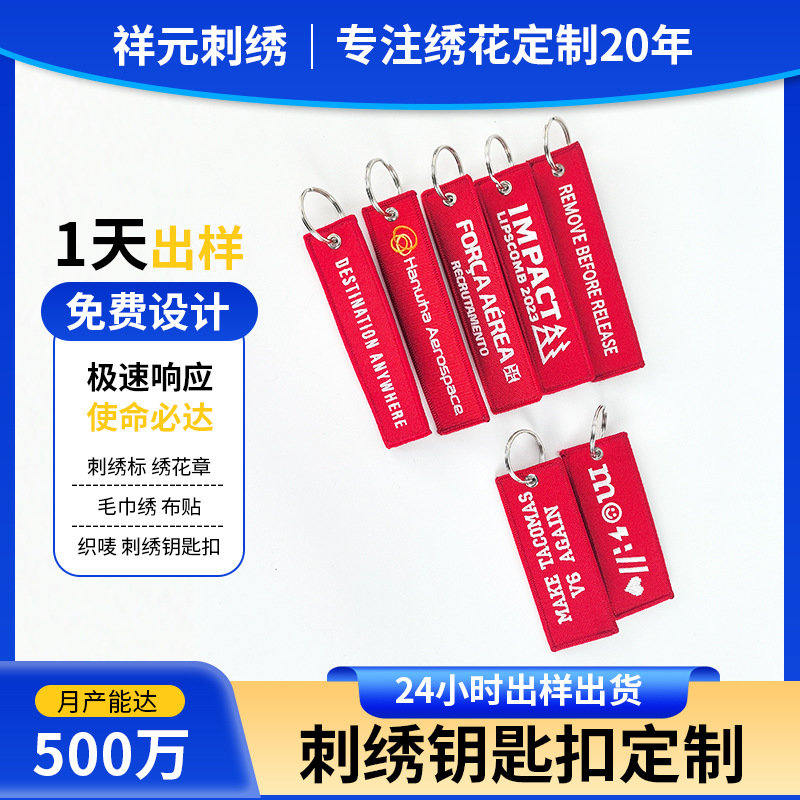 双面绣花刺绣织唛钥匙扣精致锁边刺绣布贴简约刺绣钥匙扣挂件挂饰