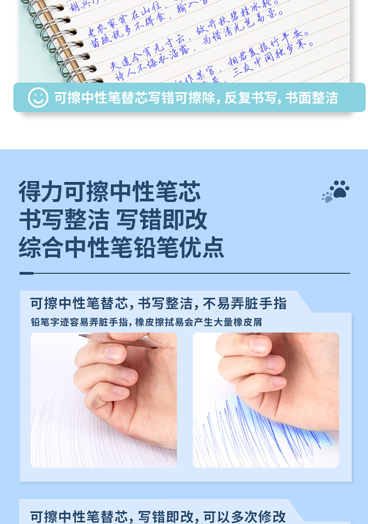 按动可擦笔芯中性笔晶蓝色热可擦3-5年级小学生用热魔摩磨易擦