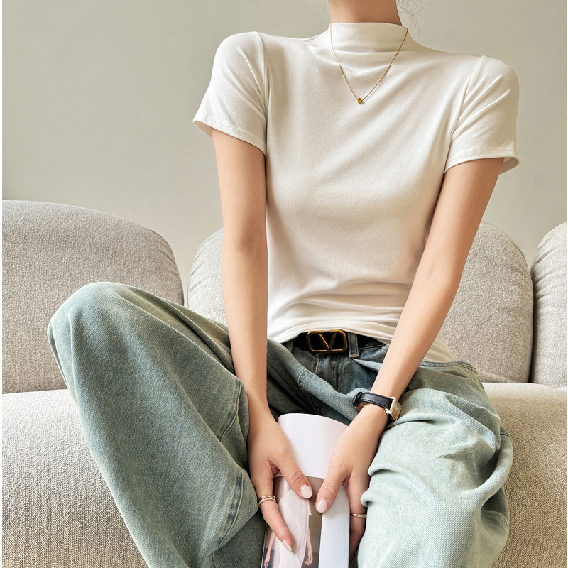 韓国秋モーダルハーフタートルネックボトリングシャツレディーストップススリムフィット半袖右肩Tシャツデザインセンス