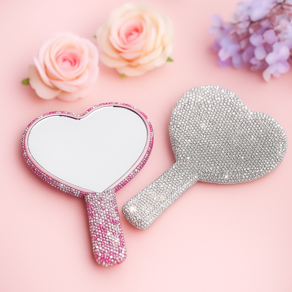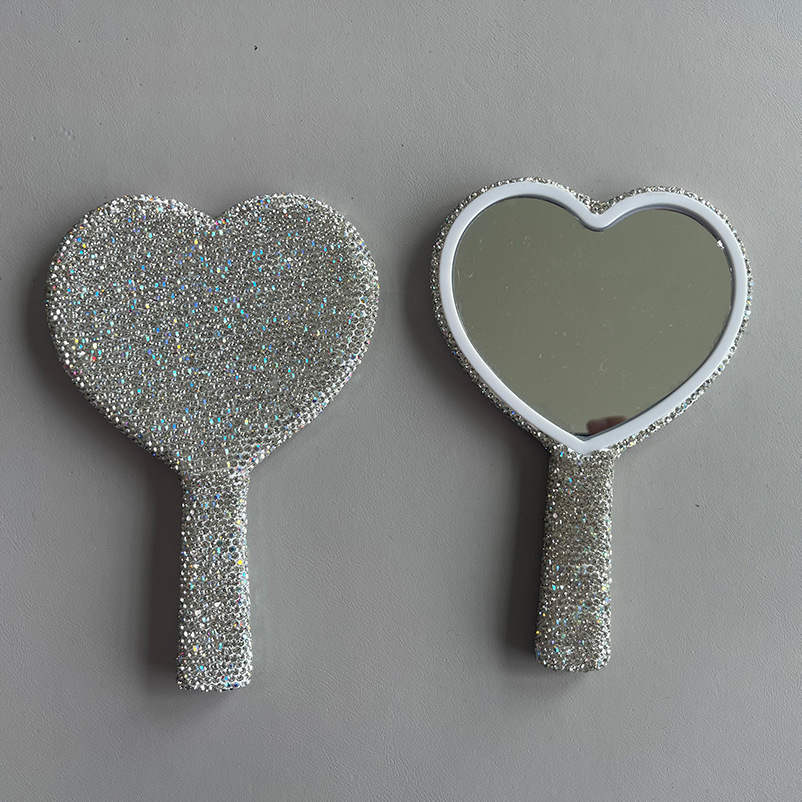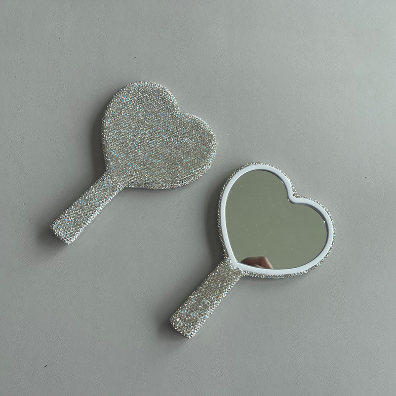 クロスボーダーダイヤモンドハンドヘルド化粧鏡、ポータブルでかわいいハンドルタイプのハンドヘルド小型ミラー、持ち運び可能、インターネットセレブのハート型