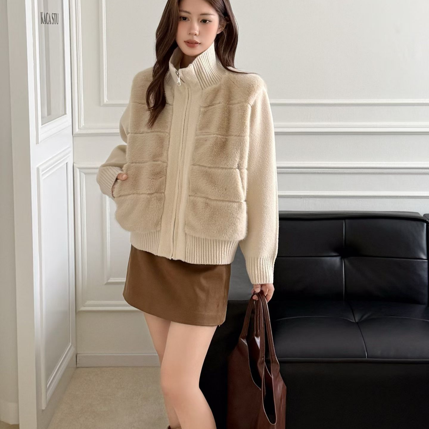 仿水貂绒拼接拉链立领针织开衫女2025秋冬新款宽松休闲毛衣外套厚